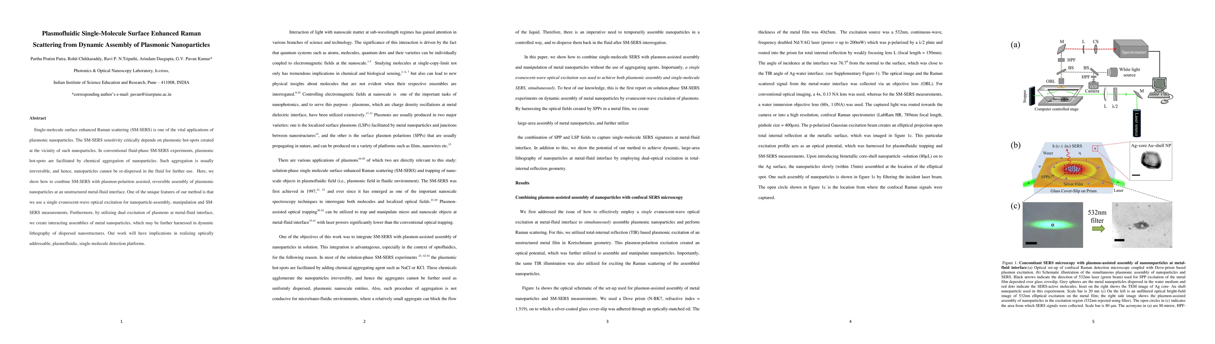 This research paper demonstrates a novel method combining single-molecule surface enhanced Raman scattering (SM-SERS) with reversible assembly of plasmonic nanoparticles using plasmofluidics. The method allows for dynamic manipulation and detection of nanoparticles through a single evanescent-wave optical excitation, paving the way for optically addressable, dynamic lithography of nanostructures.