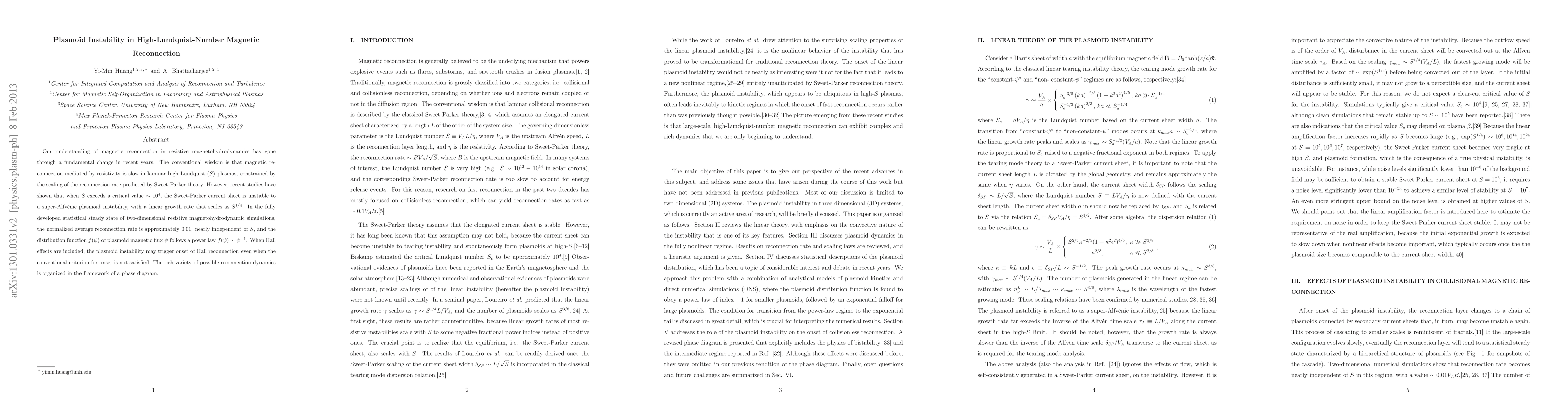 Our understanding of magnetic reconnection in resistive magnetohydrodynamics has gone through a fundamental change in recent years. The conventional wisdom is that magnetic reconnection mediated by resistivity is slow in laminar high Lundquist ($S$) plasmas, constrained by the scaling of the reconnection rate predicted by Sweet-Parker theory. However, recent studies have shown that when $S$ exceeds a critical value $\sim10^{4}$, the Sweet-Parker current sheet is unstable to a super-Alfv\'enic plasmoid instability, with a linear growth rate that scales as $S^{1/4}$. In the fully developed statistical steady state of two-dimensional resistive magnetohydrodynamic simulations, the normalized average reconnection rate is approximately 0.01, nearly independent of $S$, and the distribution function $f(\psi)$ of plasmoid magnetic flux $\psi$ follows a power law $f(\psi)\sim\psi^{-1}$. When Hall effects are included, the plasmoid instability may trigger onset of Hall reconnection even when the conventional criterion for onset is not satisfied. The rich variety of possible reconnection dynamics is organized in the framework of a phase diagram.