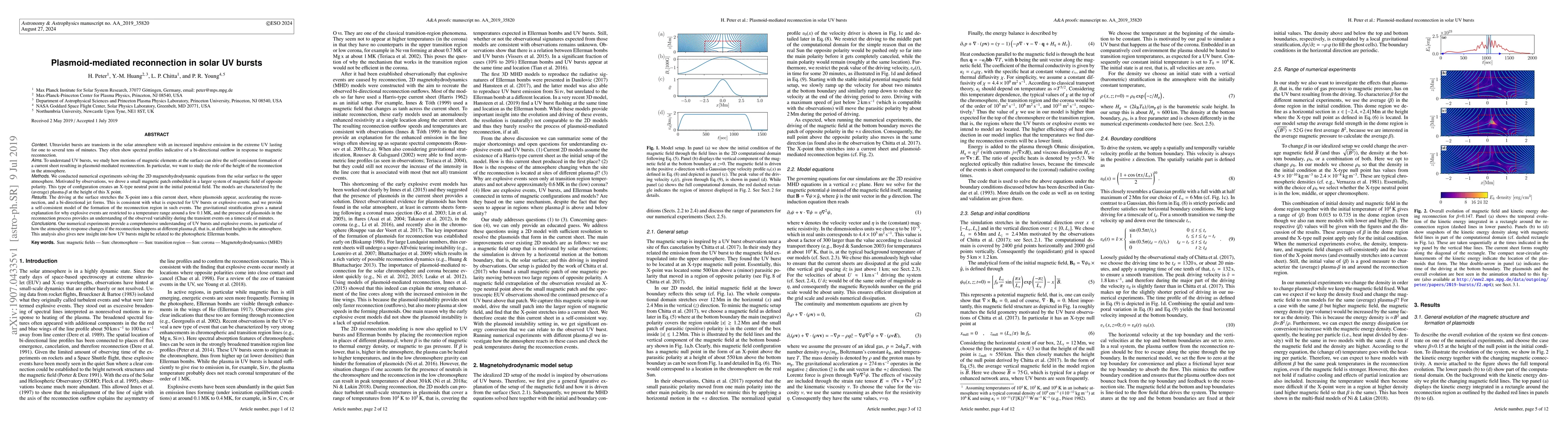 This research investigates the formation of plasmoid-mediated reconnection in solar UV bursts using numerical simulations of 2D magnetohydrodynamic (MHD) equations. The study reveals how magnetic field motions drive current sheet formation and bi-directional outflows, explaining the observed variability and the temperature range of explosive events in the solar atmosphere.