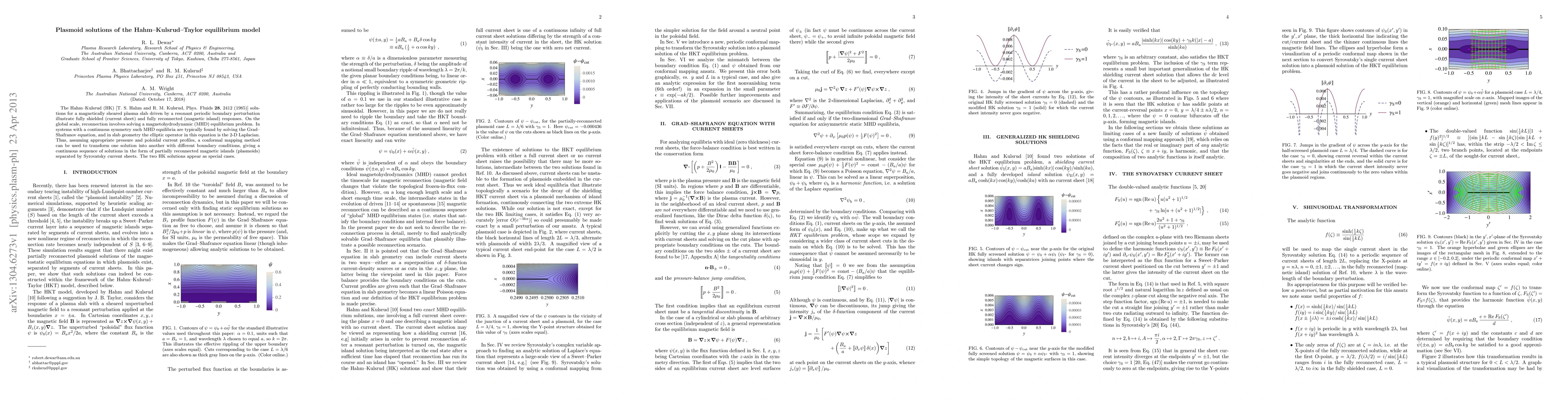 The Hahm--Kulsrud (HK) [T. S. Hahm and R. M. Kulsrud, Phys. Fluids {\bf 28}, 2412 (1985)] solutions for a magnetically sheared plasma slab driven by a resonant periodic boundary perturbation illustrate fully shielded (current sheet) and fully reconnected (magnetic island) responses. On the global scale, reconnection involves solving a magnetohydrodynamic (MHD) equilibrium problem. In systems with a continuous symmetry such MHD equilibria are typically found by solving the Grad--Shafranov equation, and in slab geometry the elliptic operator in this equation is the 2-D Laplacian. Thus, assuming appropriate pressure and poloidal current profiles, a conformal mapping method can be used to transform one solution into another with different boundary conditions, giving a continuous sequence of solutions in the form of partially reconnected magnetic islands (plasmoids) separated by Syrovatsky current sheets. The two HK solutions appear as special cases.