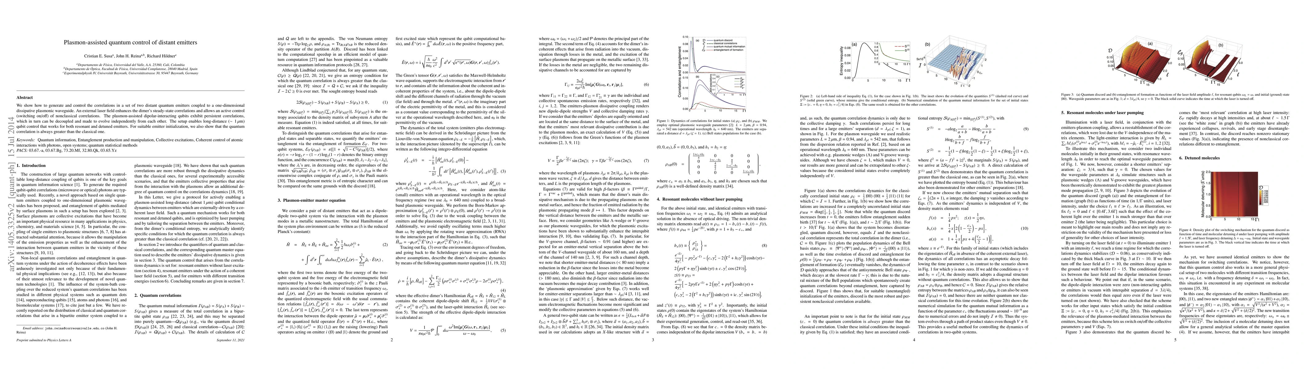 We show how to generate and control the correlations in a set of two distant quantum emitters coupled to a one-dimensional dissipative plasmonic waveguide. An external laser field enhances the dimer's steady-state correlations and allows an active control (switching on/off) of nonclassical correlations. The plasmon-assisted dipolar-interacting qubits exhibit persistent correlations, which in turn can be decoupled and made to evolve independently from each other. The setup enables long-distance ($\sim 1\, \mu$m) qubit control that works for both resonant and detuned emitters. For suitable emitter initialization, we also show that the quantum correlation is always greater than the classical one.