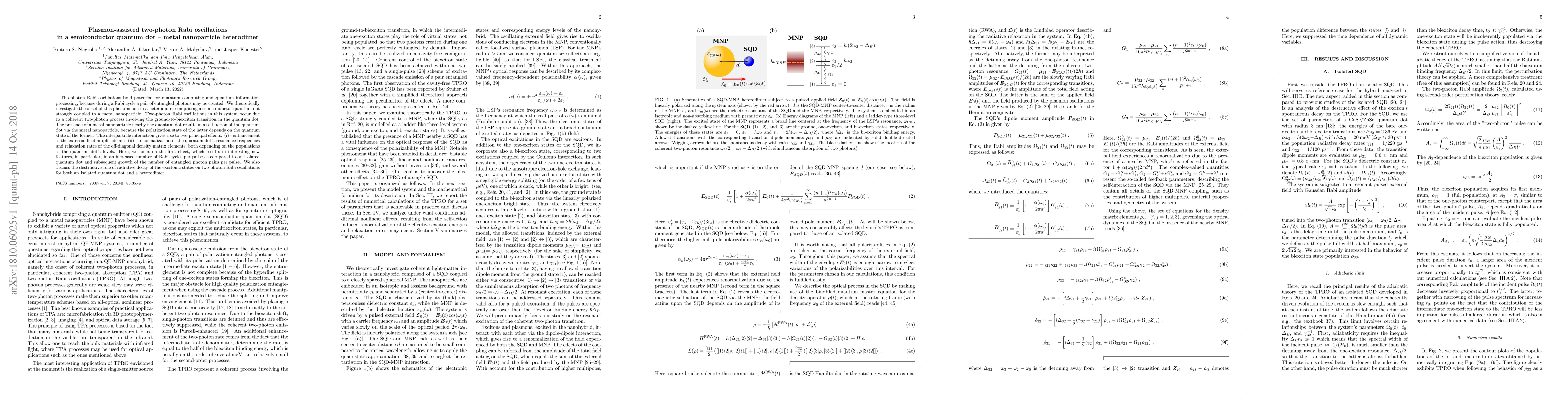 Tho-photon Rabi oscillations hold potential for quantum computing and quantum information processing, because during a Rabi cycle a pair of entangled photons may be created. We theoretically investigate the onset of this phenomenon in a heterodimer comprising a semiconductor quantum dot strongly coupled to a metal nanoparticle. Two-photon Rabi oscillations in this system occur due to a coherent two-photon process involving the ground-to-biexciton transition in the quantum dot. The presence of a metal nanoparticle nearby the quantum dot results in a self-action of the quantum dot via the metal nanoparticle, because the polatization state of the latter depends on the quantum state of the former. The interparticle interaction gives rise to two principal effects: (i) - enhancement of the external field amplitude and (ii) - renormalization of the quantum dot's resonance frequencies and relaxation rates of the off-diagonal density matrix elements, both depending on the populations of the quantum dot's levels. Here, we focus on the first effect, which results in interesting new features, in particular, in an increased number of Rabi cycles per pulse as compared to an isolated quantum dot and subsequent growth of the number of entangled photon pairs per pulse. We also discuss the destructive role of radiative decay of the excitonic states on two-photon Rabi oscillations for both an isolated quantum dot and a heterodimer.