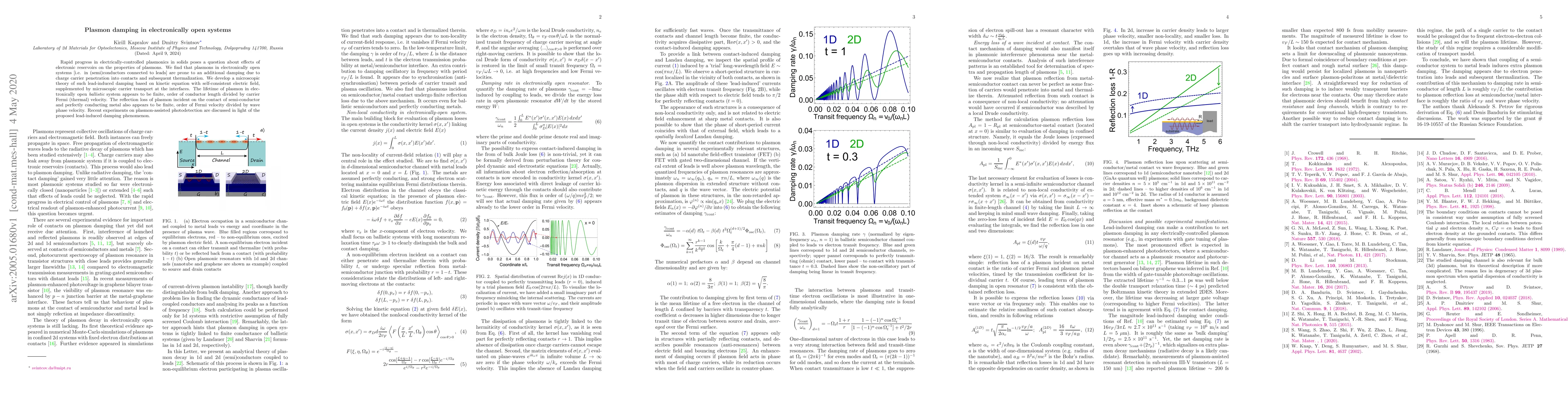 Rapid progress in electrically-controlled plasmonics in solids poses a question about effects of electronic reservoirs on the properties of plasmons. We find that plasmons in electronically open systems [i.e. in (semi)conductors connected to leads] are prone to an additional damping due to charge carrier penetration into contacts and subsequent thermalization. We develop a theory of such lead-induced damping based on kinetic equation with self-consistent electric field, supplemented by microscopic carrier transport at the interfaces. The lifetime of plasmon in electronically open ballistic system appears to be finite, order of conductor length divided by carrier Fermi (thermal) velocity. The reflection loss of plasmon incident on the contact of semi-conductor and perfectly conducting metal also appears to be finite, order of Fermi velocity divided by wave phase velocity. Recent experiments on plasmon-assisted photodetection are discussed in light of the proposed lead-induced damping phenomenon.