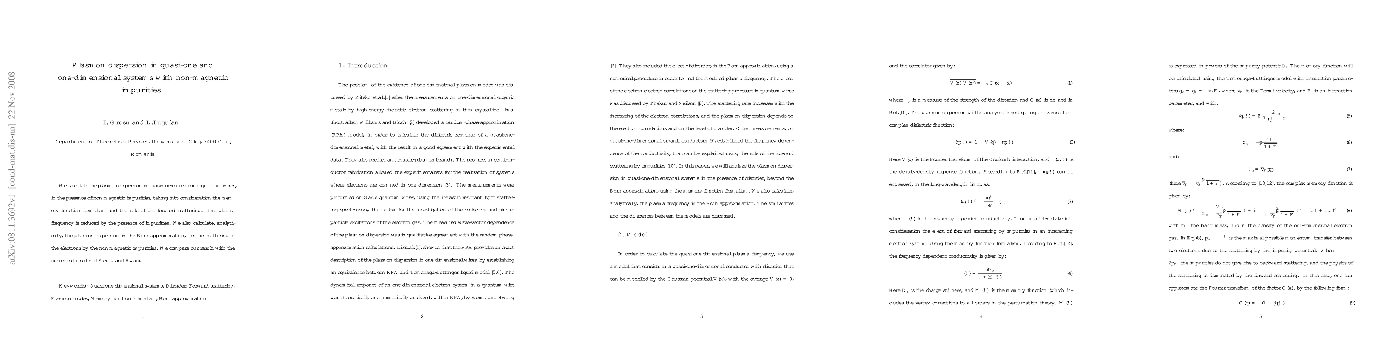Summary: This paper investigates the plasmon dispersion in quasi-one-dimensional quantum wires with non-magnetic impurities, utilizing memory function formalism and Born approximation. It finds that impurities reduce the plasma frequency and compares analytical results with numerical findings from Sarma and Hwang.