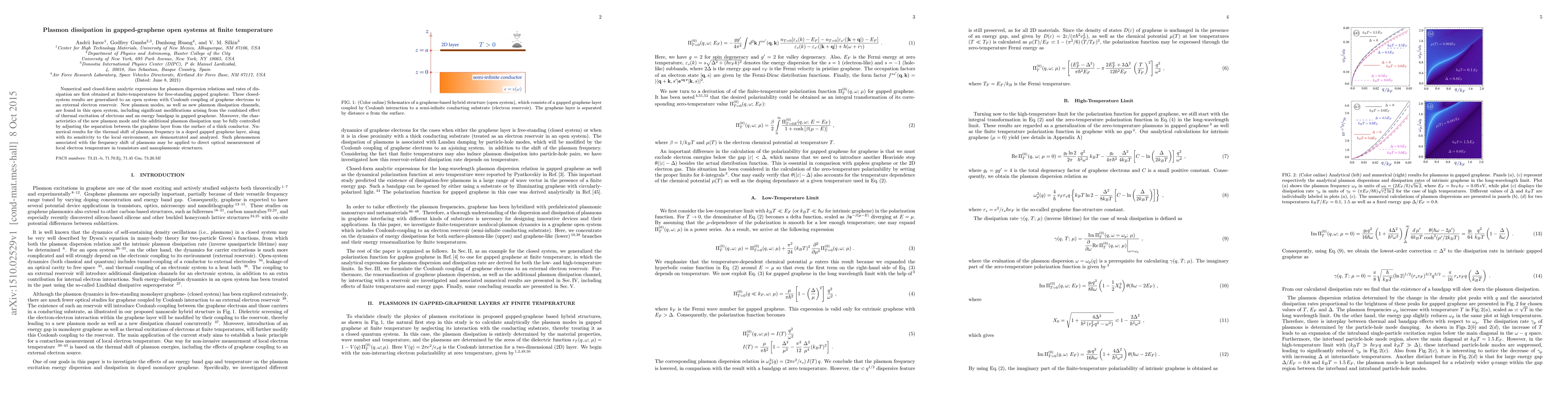 This paper investigates plasmon dissipation in gapped graphene at finite temperatures, revealing new plasmon modes and dissipation channels in open systems due to thermal excitation and bandgap effects. The study also demonstrates how the separation from a conductive surface can control these phenomena, potentially enabling optical measurement of local electron temperature in nanostructures.