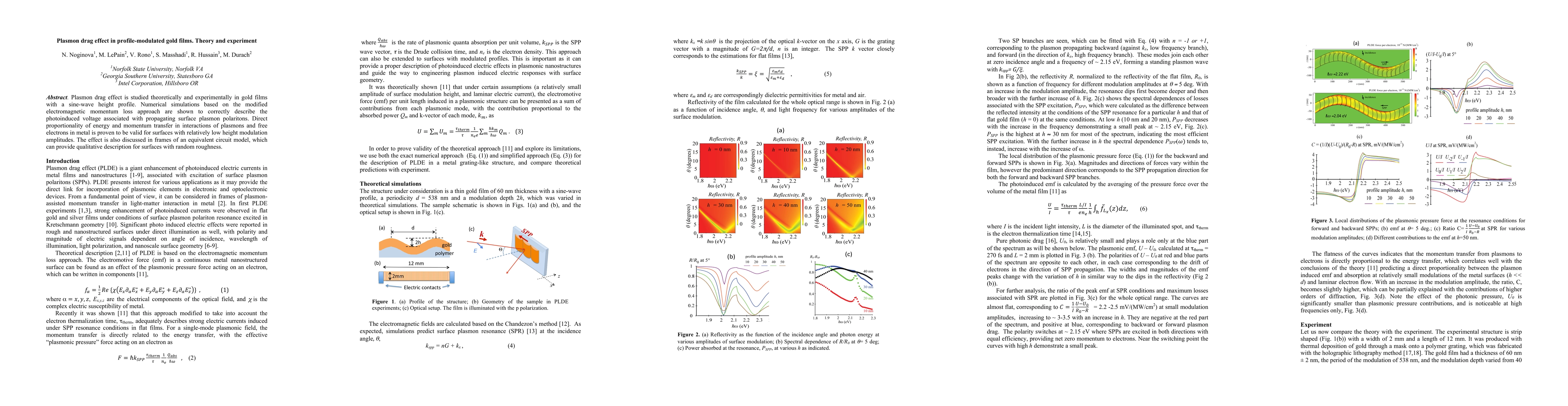 This research explores the plasmon drag effect in gold films with a sine-wave profile, validating numerical simulations based on modified electromagnetic momentum loss approach. The study finds direct proportionality between energy and momentum transfer in plasmon-electron interactions for low modulation amplitudes surfaces, and also discusses the effect using an equivalent circuit model applicable for random roughness surfaces.