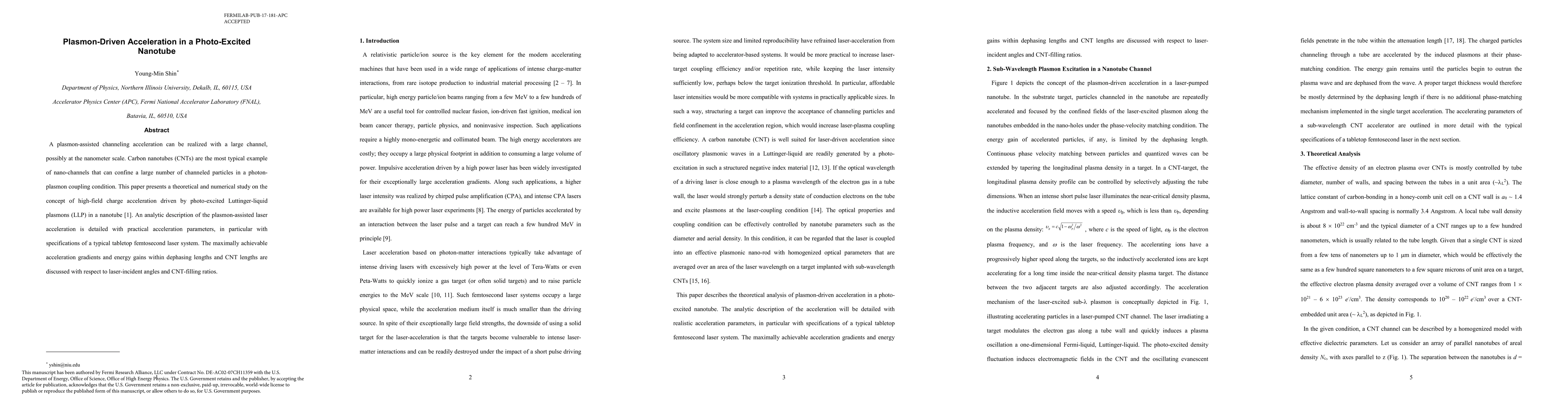 A plasmon-assisted channeling acceleration can be realized with a large channel, possibly at the nanometer scale. Carbon nanotubes (CNTs) are the most typical example of nano-channels that can confine a large number of channeled particles in a photon-plasmon coupling condition. This paper presents a theoretical and numerical study on the concept of high-field charge acceleration driven by photo-excited Luttinger-liquid plasmons (LLP) in a nanotube. An analytic description of the plasmon-assisted laser acceleration is detailed with practical acceleration parameters, in particular with specifications of a typical tabletop femtosecond laser system. The maximally achievable acceleration gradients and energy gains within dephasing lengths and CNT lengths are discussed with respect to laser-incident angles and CNT-filling ratios.