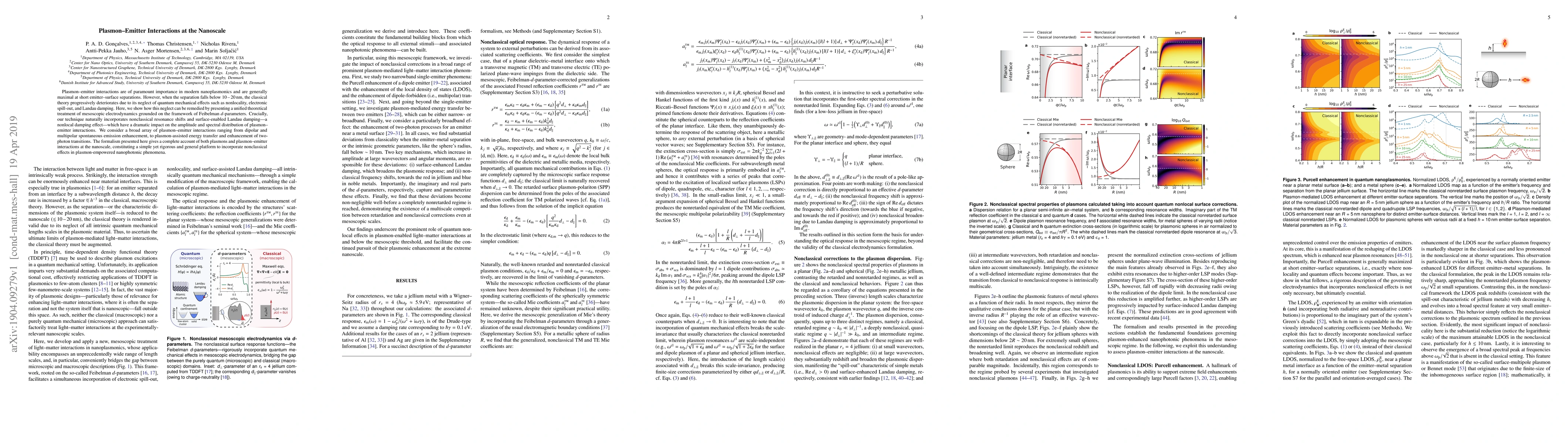 Plasmon-emitter interactions are of paramount importance in modern nanoplasmonics and are generally maximal at short emitter-surface separations. However, when the separation falls below 10-20 nm, the classical theory progressively deteriorates due to its neglect of quantum mechanical effects such as nonlocality, electronic spill-out, and Landau damping. Here, we show how this neglect can be remedied by presenting a unified theoretical treatment of mesoscopic electrodynamics grounded on the framework of Feibelman $d$-parameters. Crucially, our technique naturally incorporates nonclassical resonance shifts and surface-enabled Landau damping - a nonlocal damping effect - which have a dramatic impact on the amplitude and spectral distribution of plasmon-emitter interactions. We consider a broad array of plasmon-emitter interactions ranging from dipolar and multipolar spontaneous emission enhancement, to plasmon-assisted energy transfer and enhancement of two-photon transitions. The formalism presented here gives a complete account of both plasmons and plasmon-emitter interactions at the nanoscale, constituting a simple yet rigorous and general platform to incorporate nonclassical effects in plasmon-empowered nanophotonic phenomena.