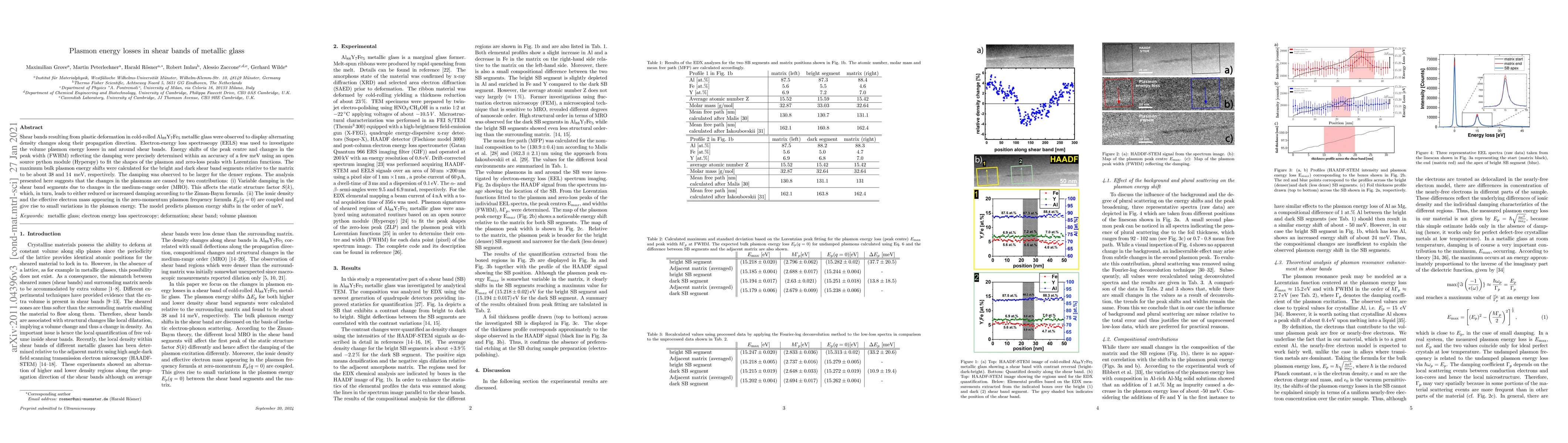 Research using electron-energy loss spectroscopy found that shear bands in metallic glass exhibit significant plasmon energy losses, with shifts of up to 38 meV in some areas, attributed to variable damping due to changes in the material's structure.