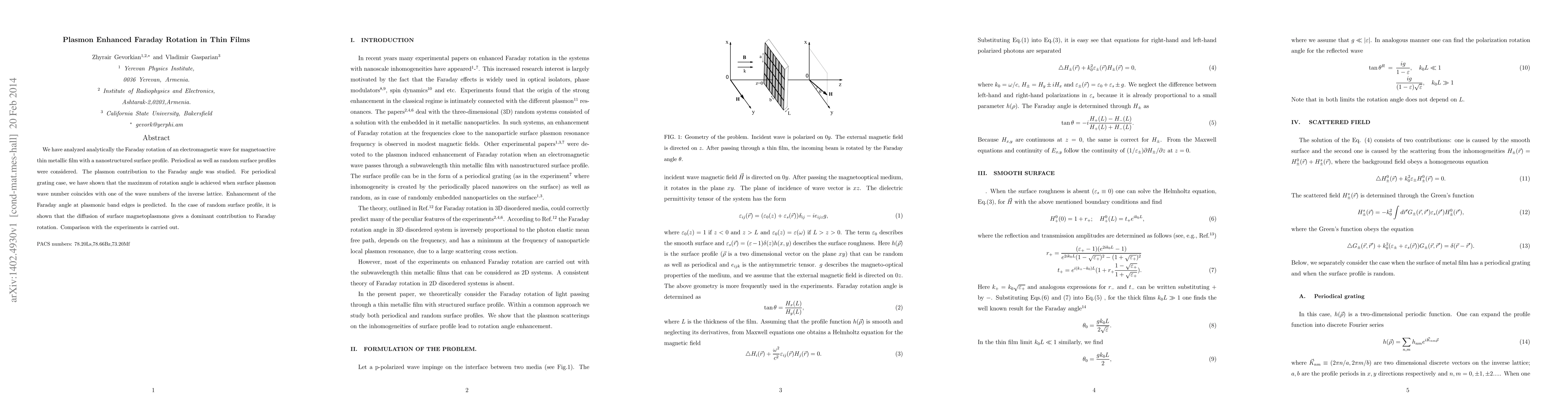 Researchers analyzed Faraday rotation in thin metallic films with nanostructured surfaces, finding that plasmons enhance rotation at specific frequencies and edge regions, with random profiles showing significant magnetoplasmonic diffusion.
