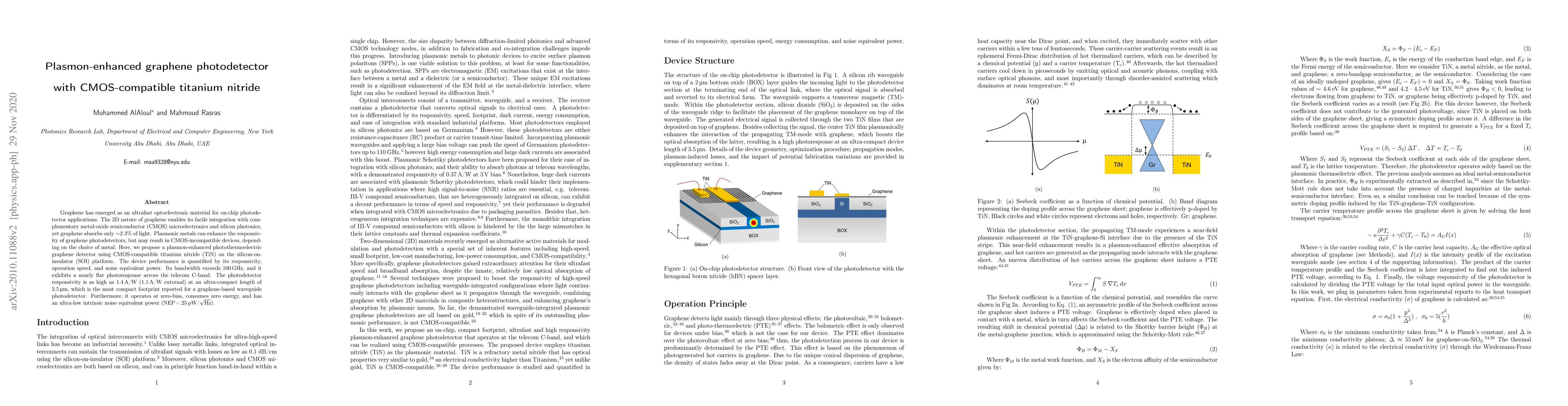 This paper proposes a highly efficient, compact plasmon-enhanced graphene photodetector using CMOS-compatible titanium nitride on an SOI platform, achieving a responsivity of 1.4 A/W and a bandwidth exceeding 100 GHz, while operating at zero-bias and ultra-low noise.
