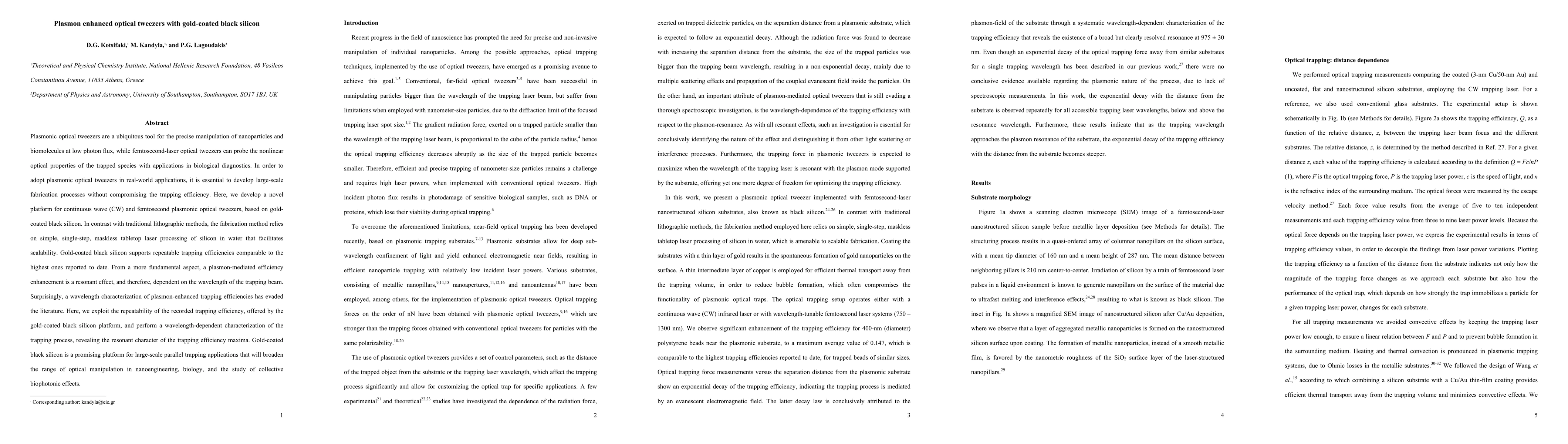 This paper develops a scalable, gold-coated black silicon platform for plasmonic optical tweezers, achieving high trapping efficiency through simple laser processing. It also reveals the resonant wavelength dependence of trapping efficiency, enhancing the potential for large-scale, parallel trapping applications in nanoengineering and biology.