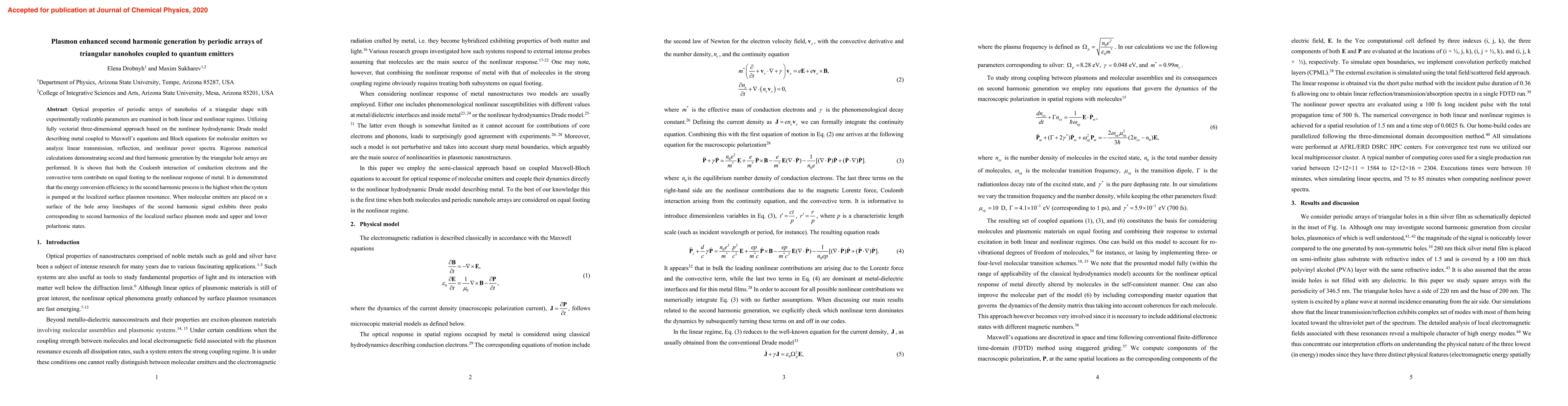 This paper investigates the optical properties of triangular nanohole arrays, demonstrating enhanced second harmonic generation through plasmonic effects. Numerical simulations reveal that the highest energy conversion efficiency occurs at the localized surface plasmon resonance, with molecular emitters producing three distinct peaks in the second harmonic signal.