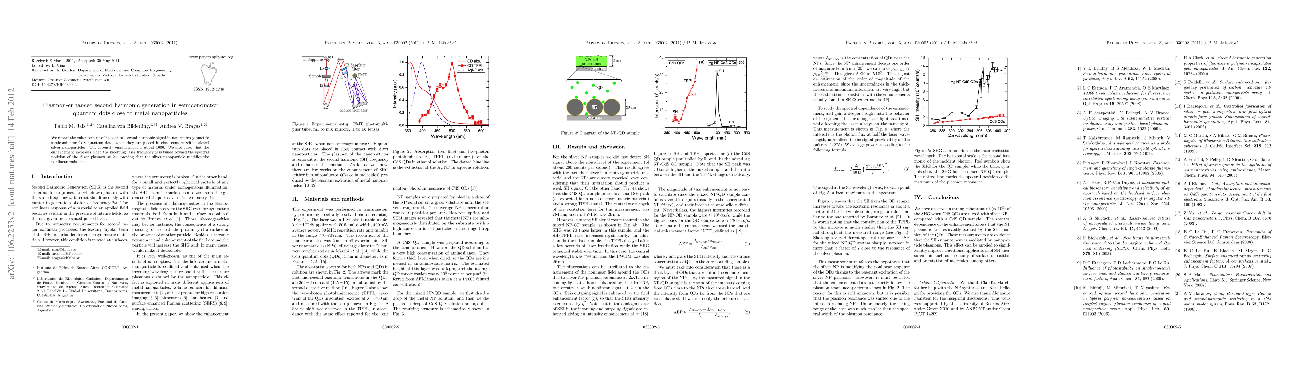 This study demonstrates a significant enhancement of second harmonic generation in CdS quantum dots near silver nanoparticles, with an intensity increase of around 1000 times. The enhancement is shown to be more pronounced when the laser frequency aligns with the silver plasmon resonance, indicating the nanoparticle's role in modifying nonlinear optical emissions.