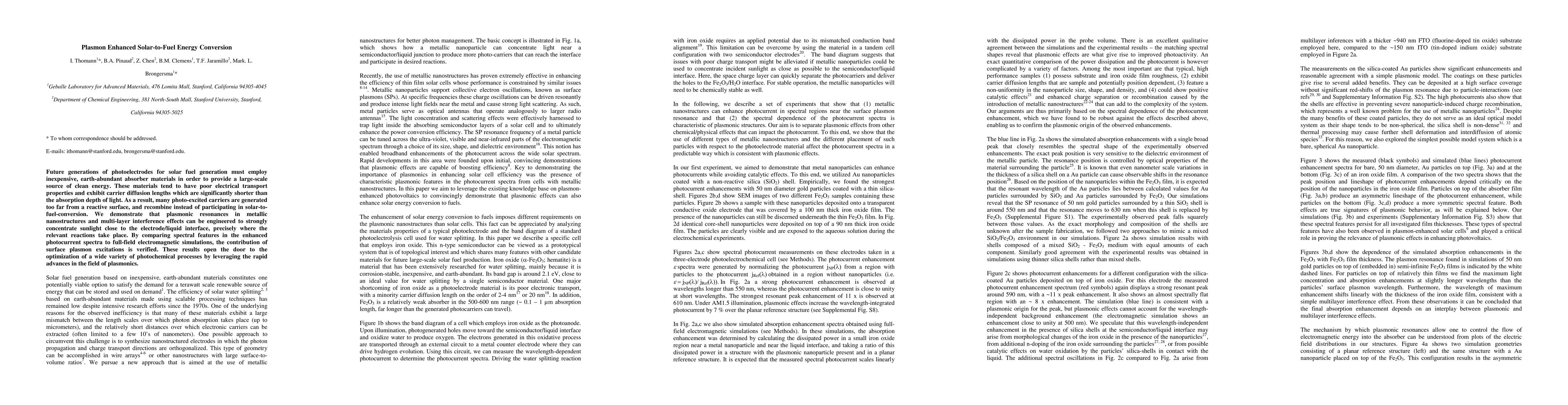 This paper demonstrates that plasmonic nanostructures and multi-layer interference can concentrate sunlight near the electrode/liquid interface, enhancing solar-to-fuel conversion efficiency by reducing carrier recombination. The study verifies the role of surface plasmon excitations through spectral analysis and electromagnetic simulations.