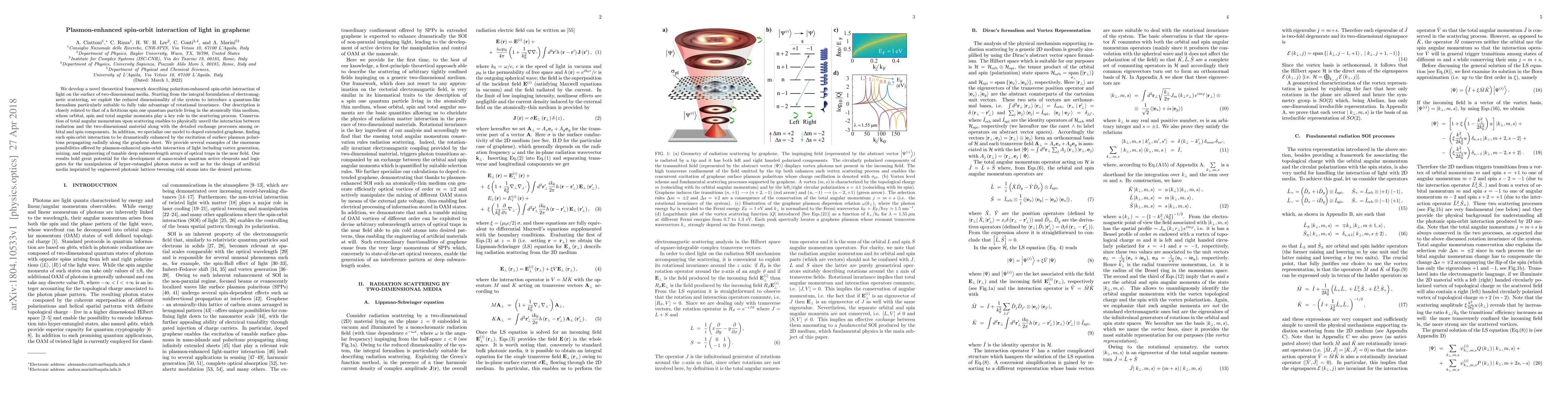 We develop a novel theoretical framework describing polariton-enhanced spin-orbit interaction of light on the surface of two-dimensional media. Starting from the integral formulation of electromagnetic scattering, we exploit the reduced dimensionality of the system to introduce a quantum-like formalism particularly suitable to fully take advantage of rotational invariance. Our description is closely related to that of a fictitious spin one quantum particle living in the atomically thin medium, whose orbital, spin and total angular momenta play a key role in the scattering process. Conservation of total angular momentum upon scattering enables to physically unveil the interaction between radiation and the two-dimensional material along with the detailed exchange processes among orbital and spin components. In addition, we specialize our model to doped extended graphene, finding such spin-orbit interaction to be dramatically enhanced by the excitation of surface plasmon polaritons propagating radially along the graphene sheet. We provide several examples of the enormous possibilities offered by plasmon-enhanced spin-orbit interaction of light including vortex generation, mixing, and engineering of tunable deep subwavelength arrays of optical traps in the near field. Our results hold great potential for the development of nano-scaled quantum active elements and logic gates for the manipulation of hyper-entangled photon states as well as for the design of artificial media imprinted by engineered photonic lattices tweezing cold atoms into the desired patterns.