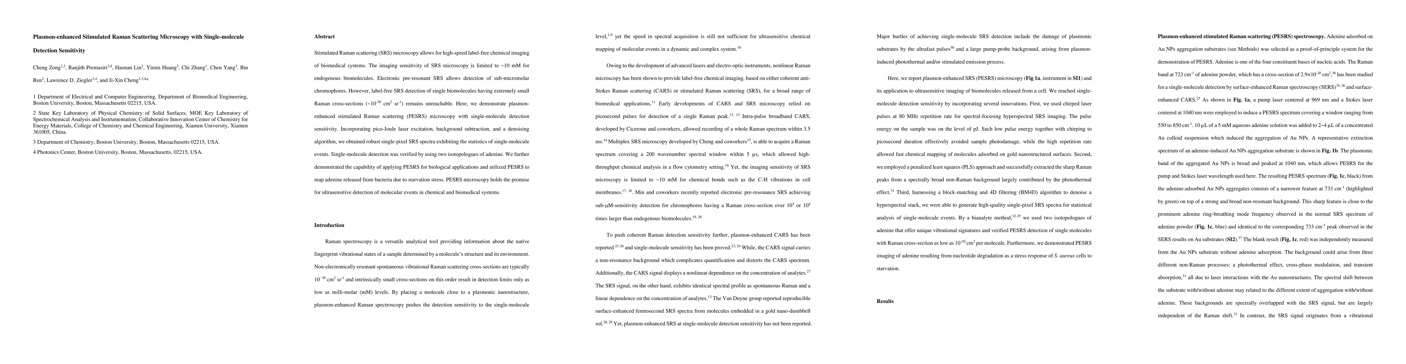 Plasmon-enhanced stimulated Raman scattering (PESRS) microscopy achieves single-molecule detection sensitivity, overcoming limitations in conventional SRS for chemical imaging of biomedical systems. This method uses pico-Joule laser excitation and advanced data processing to detect molecules like adenine at unprecedented levels.