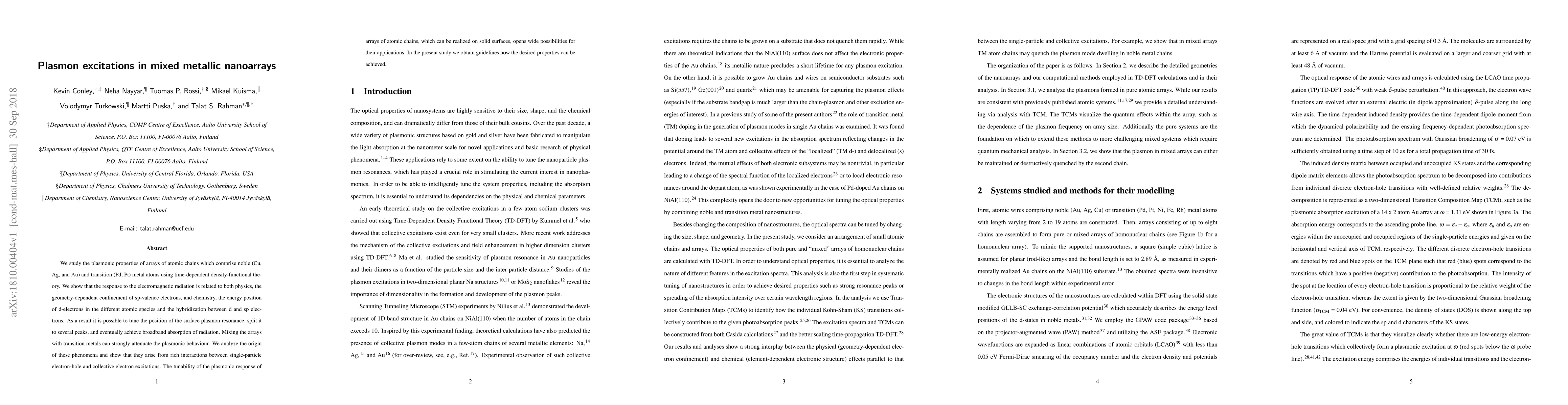 We study the plasmonic properties of arrays of atomic chains which comprise noble (Cu, Ag, and Au) and transition (Pd, Pt) metal atoms using time-dependent density-functional theory. We show that the response to the electromagnetic radiation is related to both physics, the geometry-dependent confinement of sp-valence electrons, and chemistry, the energy position of d-electrons in the different atomic species and the hybridization between d and sp electrons. As a result it is possible to tune the position of the surface plasmon resonance, split it to several peaks, and eventually achieve broadband absorption of radiation. Mixing the arrays with transition metals can strongly attenuate the plasmonic behaviour. We analyze the origin of these phenomena and show that they arise from rich interactions between single-particle electron-hole and collective electron excitations. The tunability of the plasmonic response of arrays of atomic chains, which can be realized on solid surfaces, opens wide possibilities for their applications. In the present study we obtain guidelines how the desired properties can be achieved.