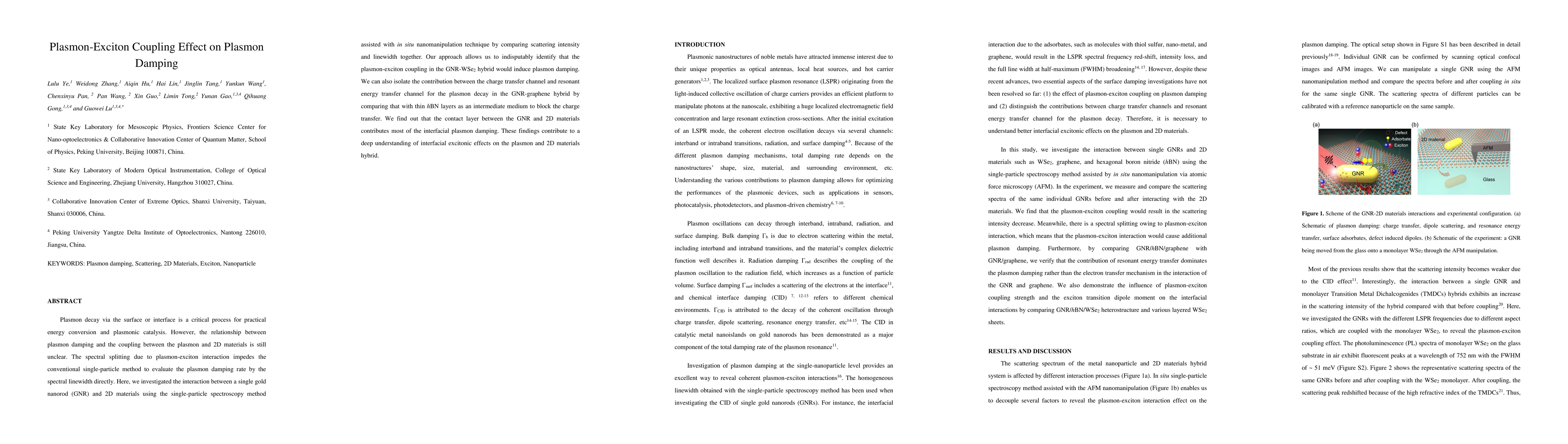 Plasmon decay via the surface or interface is a critical process for practical energy conversion and plasmonic catalysis. However, the relationship between plasmon damping and the coupling between the plasmon and 2D materials is still unclear. The spectral splitting due to plasmon-exciton interaction impedes the conventional single-particle method to evaluate the plasmon damping rate by the spectral linewidth directly. Here, we investigated the interaction between a single gold nanorod (GNR) and 2D materials using the single-particle spectroscopy method assisted with in situ nanomanipulation technique by comparing scattering intensity and linewidth together. Our approach allows us to indisputably identify that the plasmon-exciton coupling in the GNR-WSe2 hybrid would induce plasmon damping. We can also isolate the contribution between the charge transfer channel and resonant energy transfer channel for the plasmon decay in the GNR-graphene hybrid by comparing that with thin hBN layers as an intermediate medium to block the charge transfer. We find out that the contact layer between the GNR and 2D materials contributes most of the interfacial plasmon damping. These findings contribute to a deep understanding of interfacial excitonic effects on the plasmon and 2D materials hybrid.