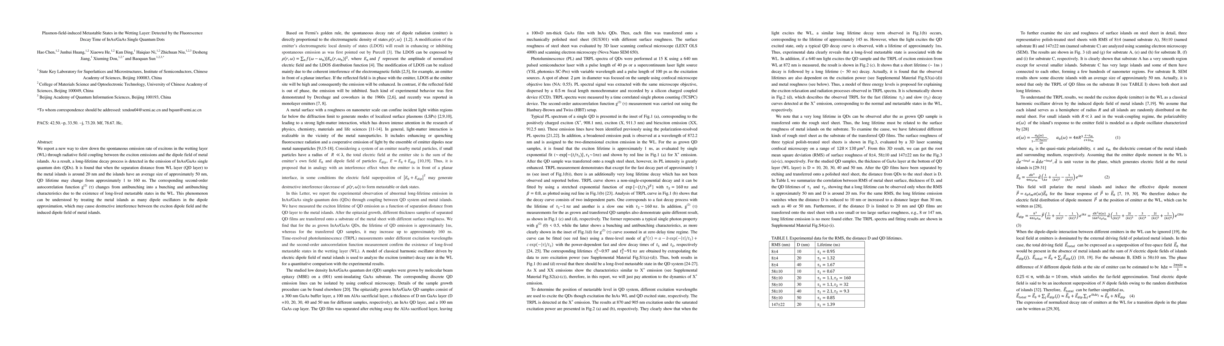 This paper explores how plasmonic metal islands can slow down the emission rate of excitons in the wetting layer, leading to long-lived metastable states detected via fluorescence decay time in InAs/GaAs quantum dots. The QD lifetime increases significantly from 1 to 160 ns when the metal islands are positioned 20 nm away, demonstrating a shift from antibunching to bunching in the emission characteristics.