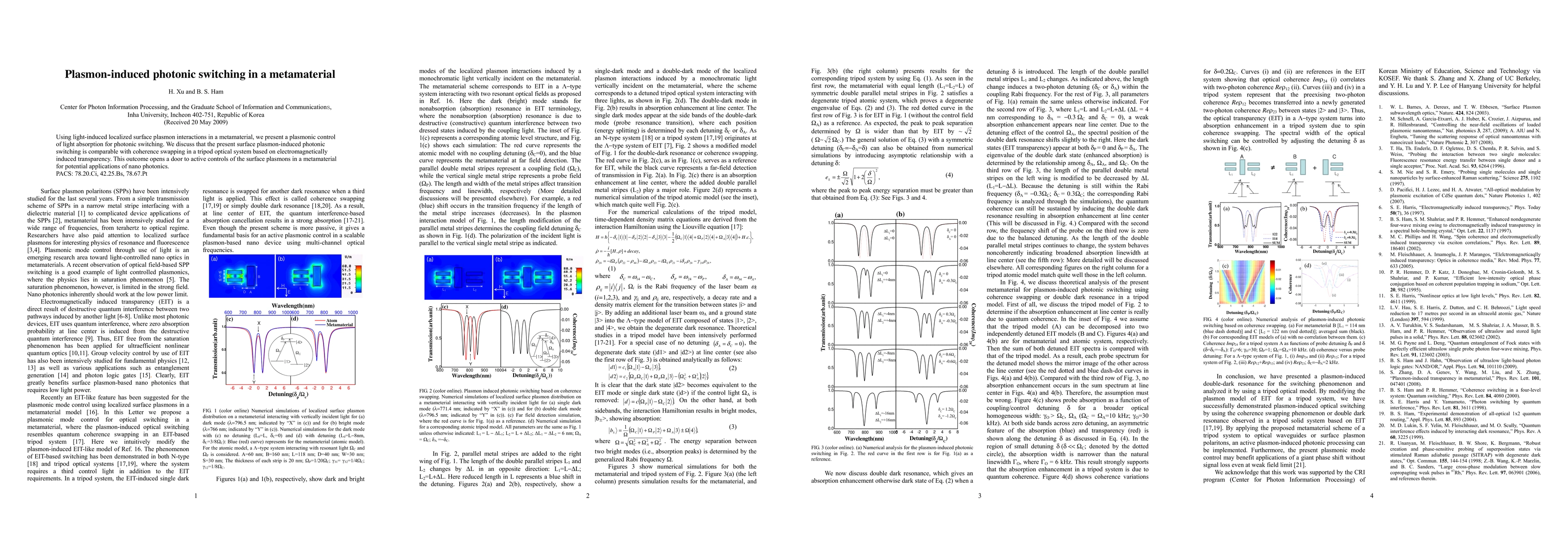 This paper demonstrates plasmonic control of light absorption in a metamaterial through localized surface plasmon interactions, achieving photonic switching comparable to coherence swapping in tripod optical systems. The findings suggest potential for active surface plasmon manipulation in metamaterials, with implications for nano photonics applications.