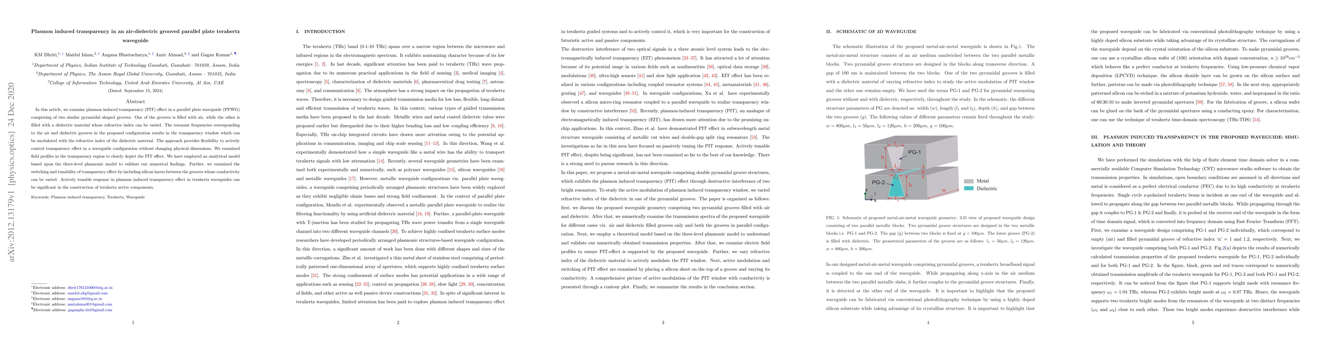 This paper investigates plasmon induced transparency (PIT) in a terahertz parallel plate waveguide with grooved structures, demonstrating tunable transparency by varying the dielectric material's refractive index. The study uses an analytical model to validate findings and highlights the potential for creating active terahertz components.