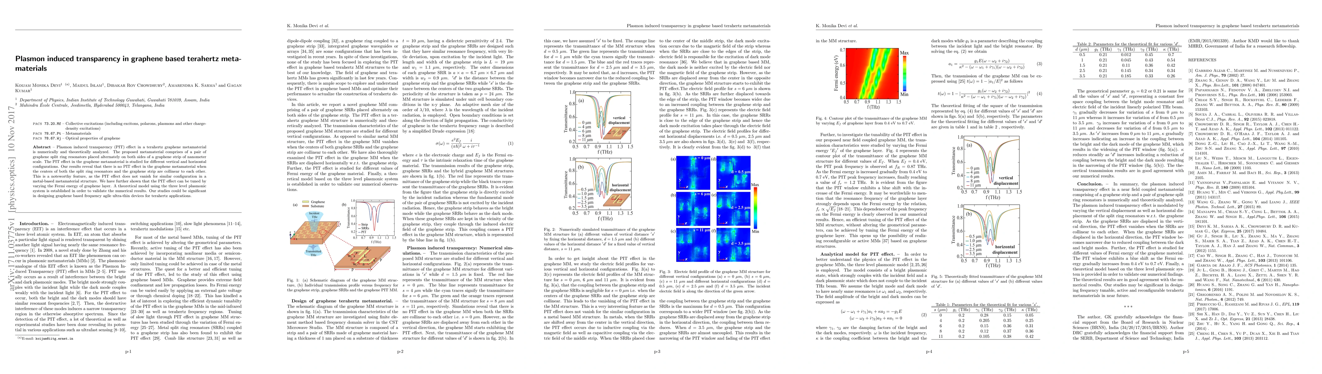 This paper investigates the plasmon induced transparency (PIT) effect in a graphene-based terahertz metamaterial composed of split ring resonators and a graphene strip. It finds no PIT effect when the resonators and strip are collinear, unlike in metal-based metamaterials, and demonstrates tunability via graphene's Fermi energy.