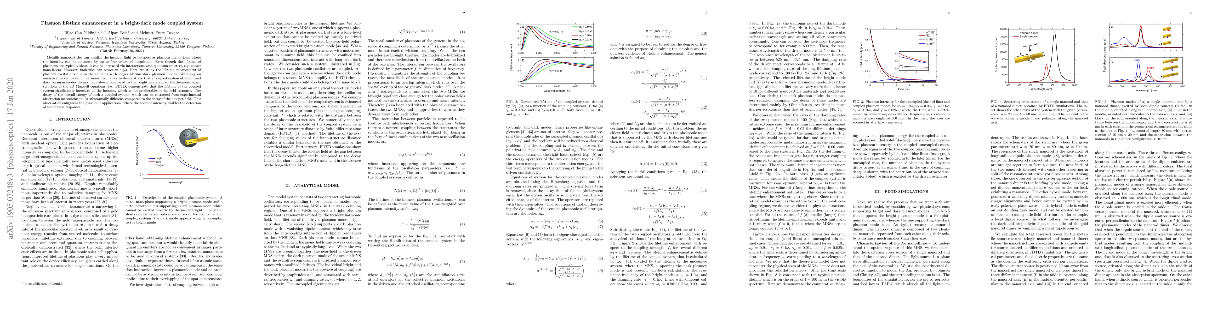 Metallic nanoparticles can localize the incident light to hotspots as plasmon oscillations, where the intensity can be increased up to four orders of magnitude. Even though the lifetime of plasmons are typically short, it can be increased via interactions with quantum emitters, e.g. spaser nano-lasers. However, molecules can bleach in days. Here, we study the lifetime enhancement of plasmon excitations due to the coupling with longer lifetime dark plasmon modes. Exact solutions of the 3D Maxwell equations, i.e. FDTD, demonstrates that the lifetime of the coupled system increases, as also predicted by a basic oscillator model. We report an optimum bright-dark plasmon mode coupling, where lifetime enhancement becomes maximum, and show that no precise positioning of the nanostructures is required to obtain enhanced lifetime.