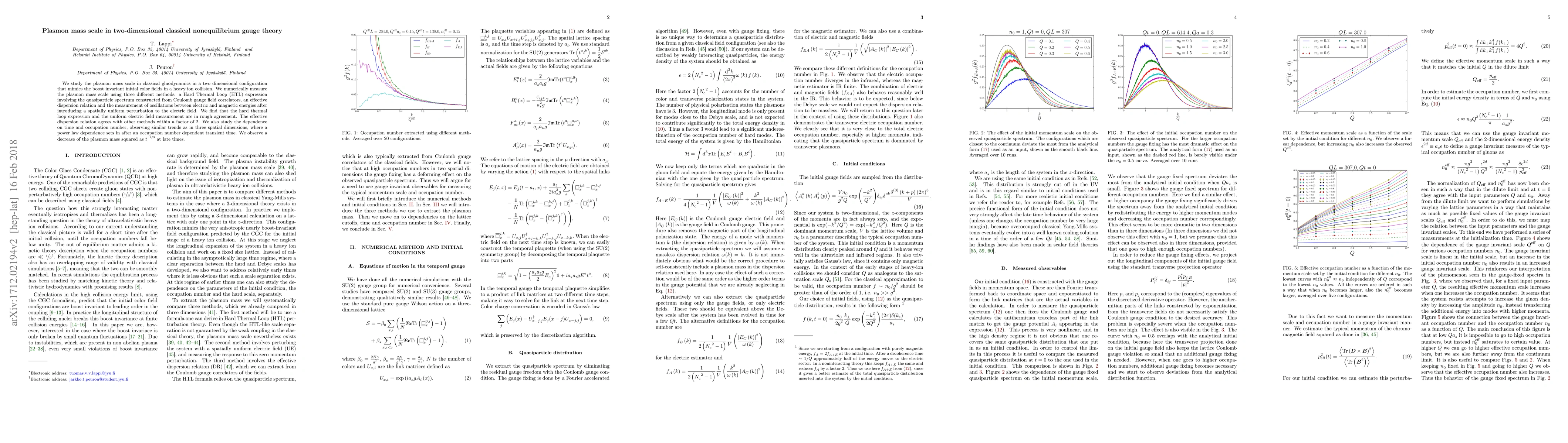 We study the plasmon mass scale in weakly coupled strongly interacting nonabelian gauge theory in a two dimensional configuration that mimics the boost invariant initial color fields in a heavy ion collision. We numerically measure the plasmon mass scale using three different methods: a Hard Thermal Loop (HTL) expression involving the quasiparticle spectrum constructed from Coulomb gauge field correlators, an effective dispersion relation and the measurement of oscillations between electric and magnetic energies after introducing a spatially uniform perturbation to the electric field. We find that the hard thermal loop expression and the uniform electric field measurement are in rough agreement. The effective dispersion relation agrees with other methods within a factor of two. We also study the dependence on time and occupation number, observing similar trends as in three spatial dimensions, where a power law dependence sets in after an occupation number dependent transient time. We observe a decrease of the plasmon mass squared as $t^{\frac{-1}{3}}$ at late times.