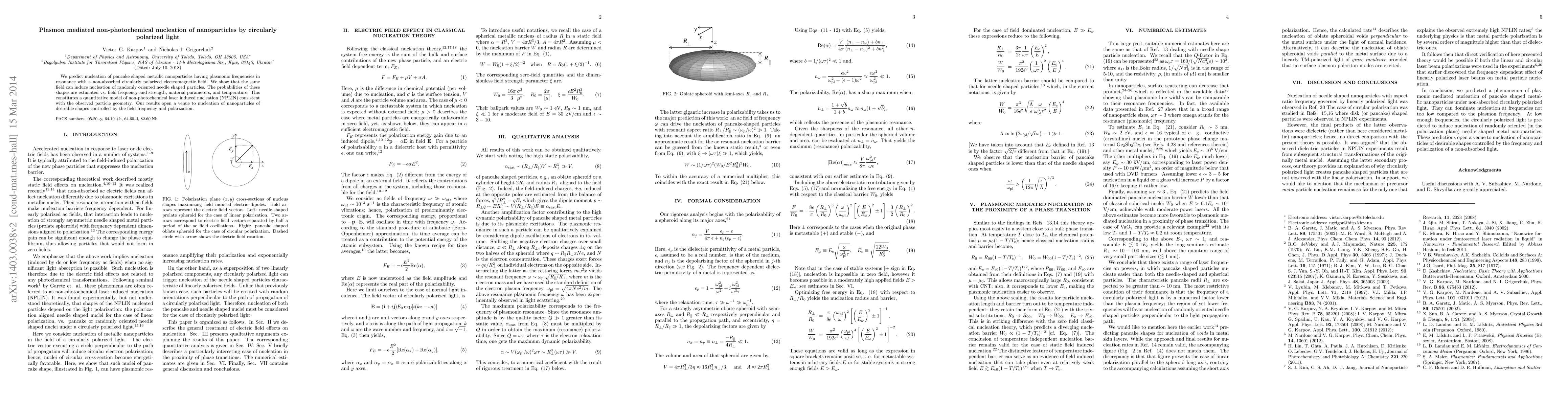 We predict nucleation of pancake shaped metallic nanoparticles having plasmonic frequencies in resonance with a non-absorbed circularly polarized electromagnetic field. We show that the same field can induce nucleation of randomly oriented needle shaped particles. The probabilities of these shapes are estimated vs. field frequency and strength, material parameters, and temperature. This constitutes a quantitative model of non-photochemical laser induced nucleation (NPLIN) consistent with the observed particle geometry. Our results open a venue to nucleation of nanoparticles of desirable shapes controlled by the field frequency and polarization.