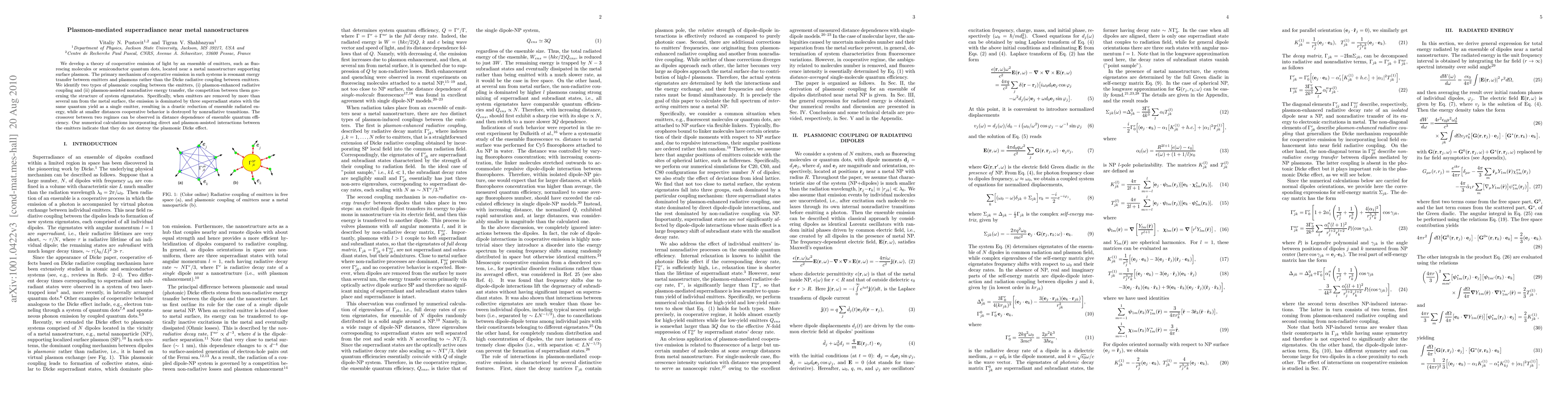 This paper develops a theory for cooperative light emission by emitters near metal nanostructures supporting surface plasmons, identifying two types of plasmonic coupling that govern system eigenstates. The study finds that at larger distances, superradiant states dominate, while at smaller distances, nonradiative transitions disrupt cooperative behavior, with the crossover between regimes observable in the distance dependence of quantum efficiency.