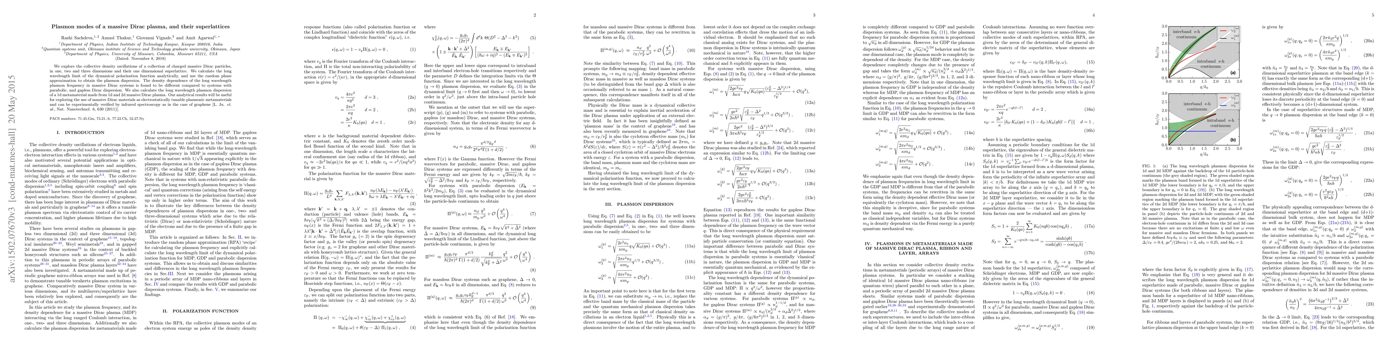 We explore the collective density oscillations of a collection of charged massive Dirac particles, in one, two and three dimensions and their one dimensional superlattice. We calculate the long wavelength limit of the dynamical polarization function analytically, and use the random phase approximation to obtain the plasmon dispersion. The density dependence of the long wavelength plasmon frequency in massive Dirac systems is found to be different compared to systems with parabolic, and gapless Dirac dispersion. We also calculate the long wavelength plasmon dispersion of a 1d metamaterial made from 1d and 2d massive Dirac plasma. Our analytical results will be useful for exploring the use of massive Dirac materials as electrostatically tunable plasmonic metamaterials and can be experimentally verified by infrared spectroscopy as in the case of graphene [L. Ju. et. al., Nat. Nanotechnol. 6, 630 (2011)].