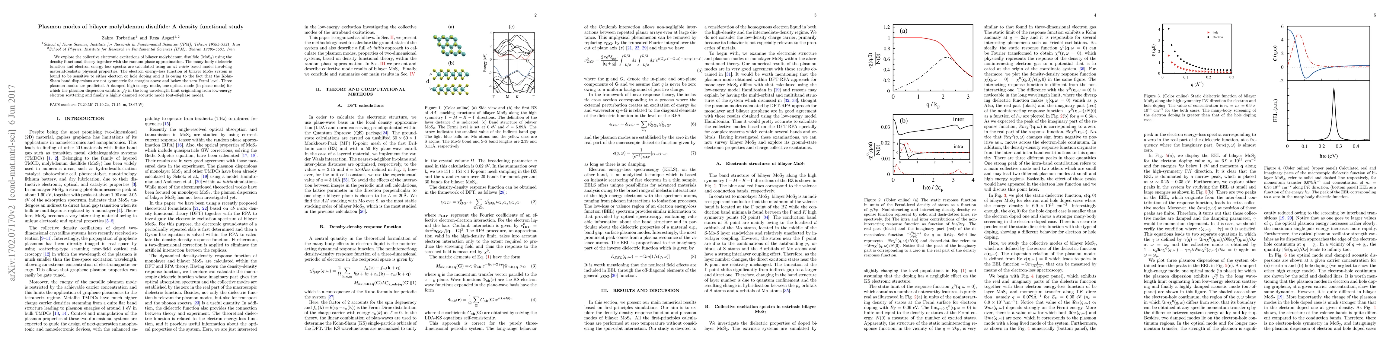 We explore the collective electronic excitations of bilayer molybdenum disulfide (MoS$_2$) using the density functional theory together with the random phase approximation. The many-body dielectric function and electron energy-loss spectra are calculated using an {\it ab initio} based model involving material-realistic physical properties. The electron energy-loss function of bilayer MoS$_2$ system is found to be sensitive to either electron or hole doping and it is owing to the fact that the Kohn-Sham band dispersions are not symmetric for energies above and below the zero Fermi level. Three plasmon modes are predicted. A damped high-energy mode, one optical mode (in-phase mode) for which the plasmon dispersion exhibits $\sqrt q $ in the long wavelength limit originating from low-energy electron scattering and finally a highly damped acoustic mode (out-of-phase mode).