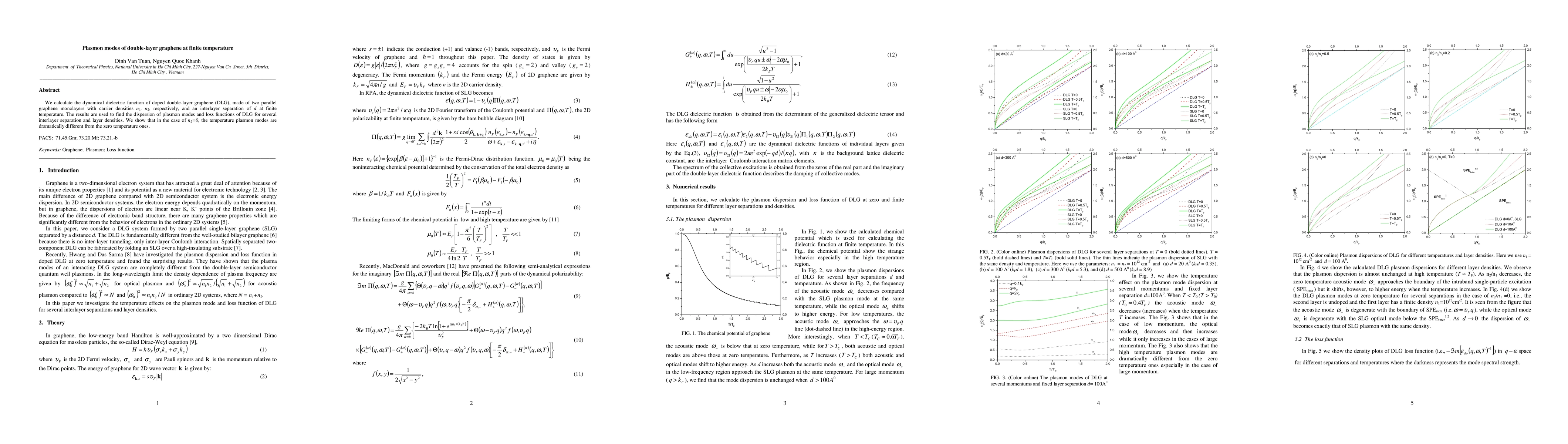 Summary: This study calculates the dynamical dielectric function of doped double-layer graphene at finite temperature, revealing distinct temperature-induced changes in plasmon mode dispersion and loss functions, particularly when the second layer has zero carrier density.