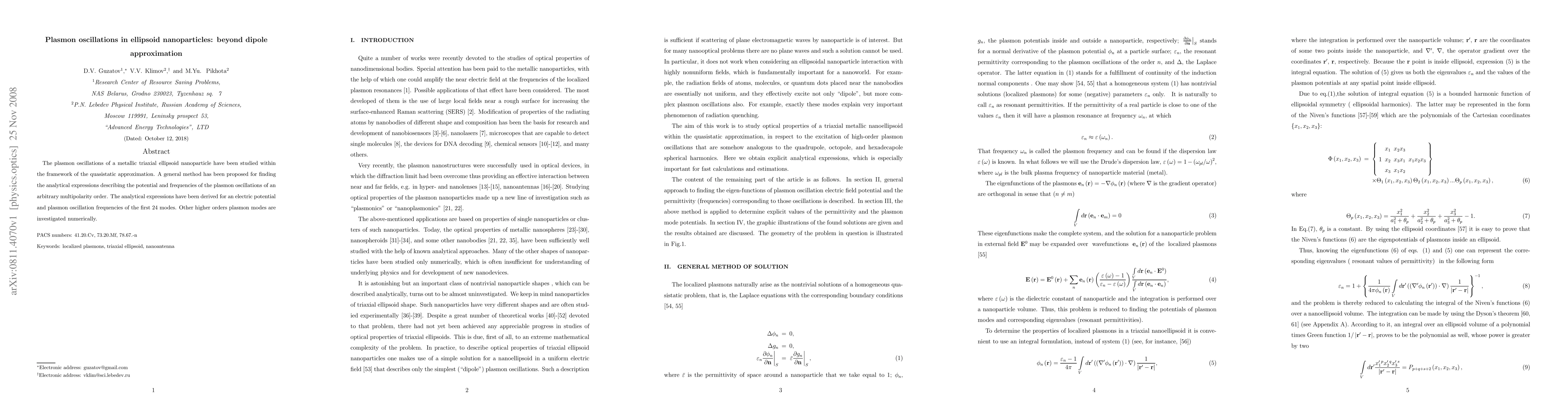 Researchers developed a method to study plasmon oscillations in metallic ellipsoid nanoparticles, extending beyond the dipole approximation, and derived analytical expressions for 24 plasmon modes.