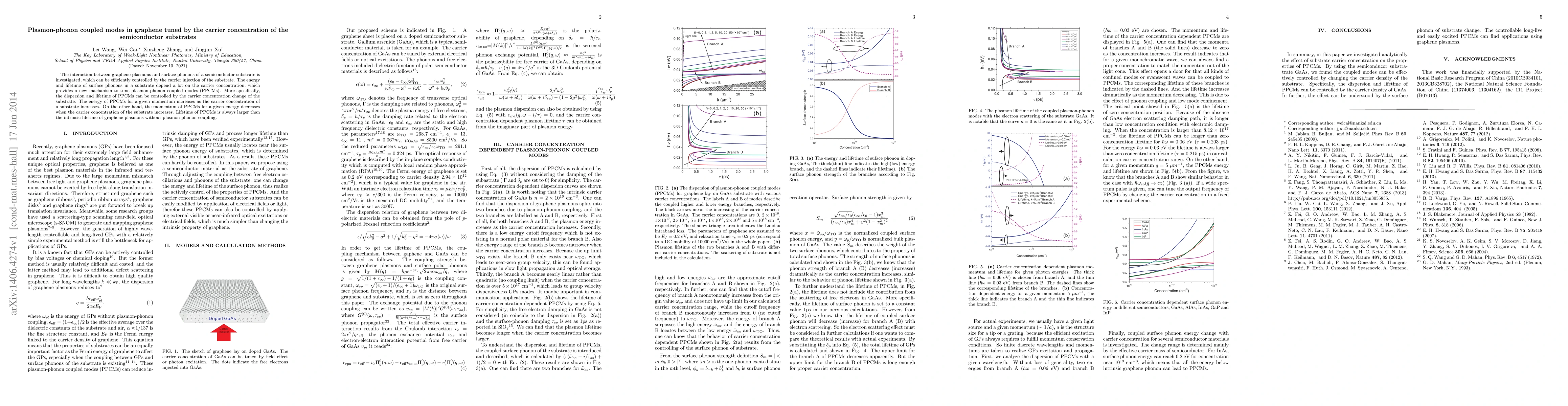 This paper investigates how the interaction between graphene plasmons and semiconductor substrate surface phonons can be tuned by adjusting the substrate's carrier concentration. The study reveals that the energy and lifetime of plasmon-phonon coupled modes (PPCMs) are significantly influenced by the carrier concentration, allowing for precise control over the dispersion and lifetime of these coupled modes.