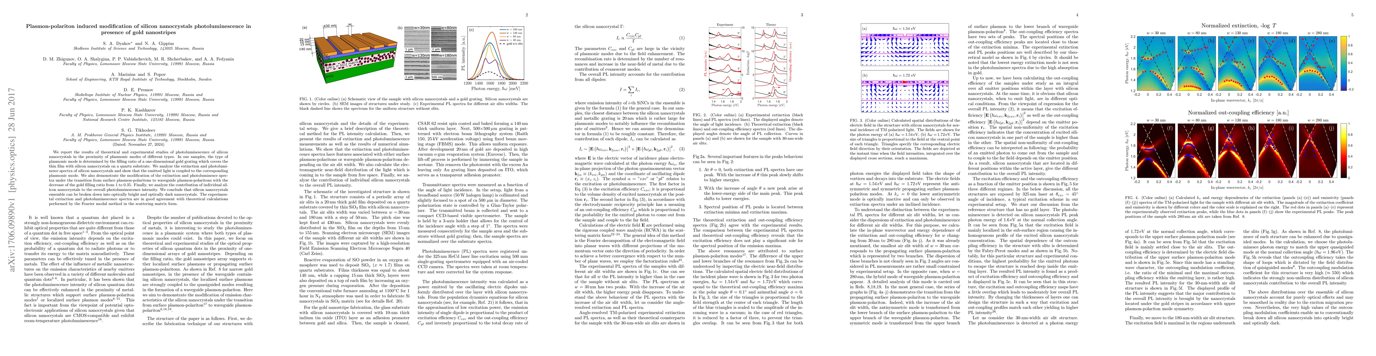 This paper investigates how silicon nanocrystals' photoluminescence is modified by the presence of gold nanostripes, showing that the coupling to plasmonic modes depends on the gold filling ratio. The study reveals a transition from surface to waveguide plasmon-polaritons, leading to distinct extinction and photoluminescence spectra, and identifies optically bright and dark silicon nanocrystals.