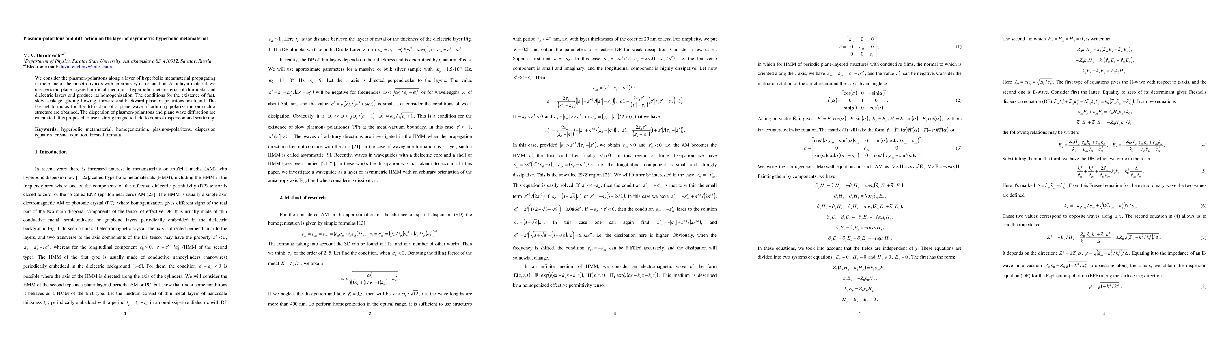 This paper investigates plasmon-polaritons in a hyperbolic metamaterial layer, identifying conditions for various types of plasmon-polaritons. It also derives Fresnel formulas for diffraction on this structure and calculates the dispersion of plasmon-polaritons and plane wave diffraction.