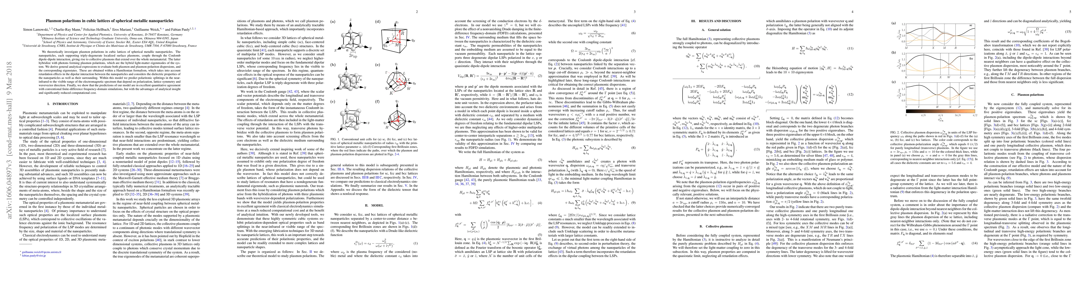 This paper theoretically explores plasmon polaritons in cubic lattices of metallic nanoparticles, revealing their collective plasmon coupling and hybridization with photons. Analytical expressions derived using a Hamiltonian model predict spectral splittings in the visible to near-infrared range, which align well with numerical simulations, offering both computational efficiency and deeper insight.