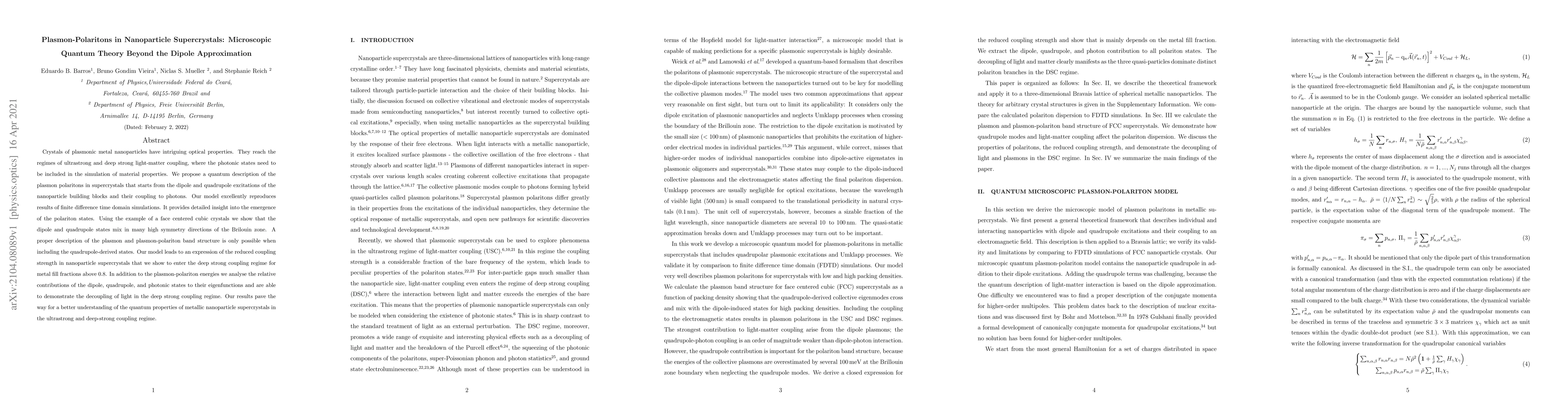 Researchers develop a quantum model to describe plasmon-polaritons in nanoparticle supercrystals, revealing that quadrupole excitations are crucial for understanding ultrastrong light-matter coupling.