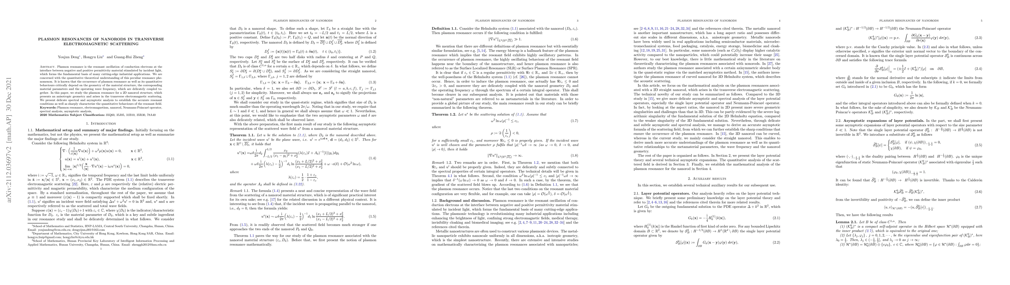 Plasmon resonance is the resonant oscillation of conduction electrons at the interface between negative and positive permittivity material stimulated by incident light, which forms the fundamental basis of many cutting-edge industrial applications. We are concerned with the quantitative theoretical understanding of this peculiar resonance phenomenon. It is known that the occurrence of plasmon resonance as well as its quantitative behaviours critically depend on the geometry of the material structure, the corresponding material parameters and the operating wave frequency, which are delicately coupled together. In this paper, we study the plasmon resonance for a 2D nanorod structure, which presents an anisotropic geometry and arises in the transverse electromagnetic scattering. We present delicate spectral and asymptotic analysis to establish the accurate resonant conditions as well as sharply characterize the quantitative behaviours of the resonant field.