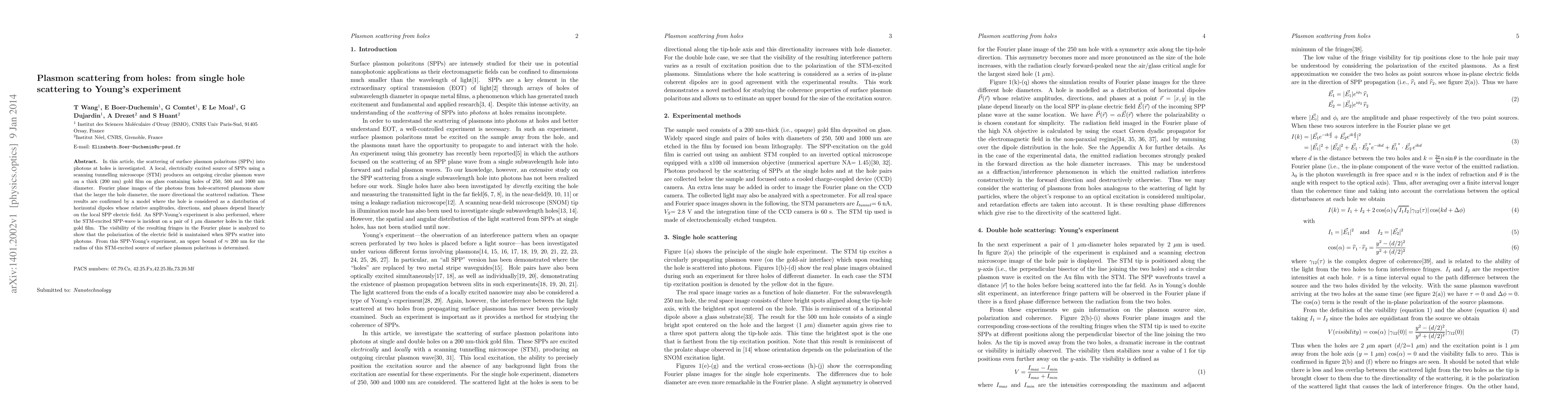 This paper investigates the scattering of surface plasmon polaritons (SPPs) into photons at holes in gold films, showing that larger hole diameters result in more directional scattering. An SPP-Young's experiment is conducted to demonstrate the maintenance of polarization when SPPs scatter into photons, determining an upper bound of approximately 200 nm for the radius of the STM-excited SPP source.