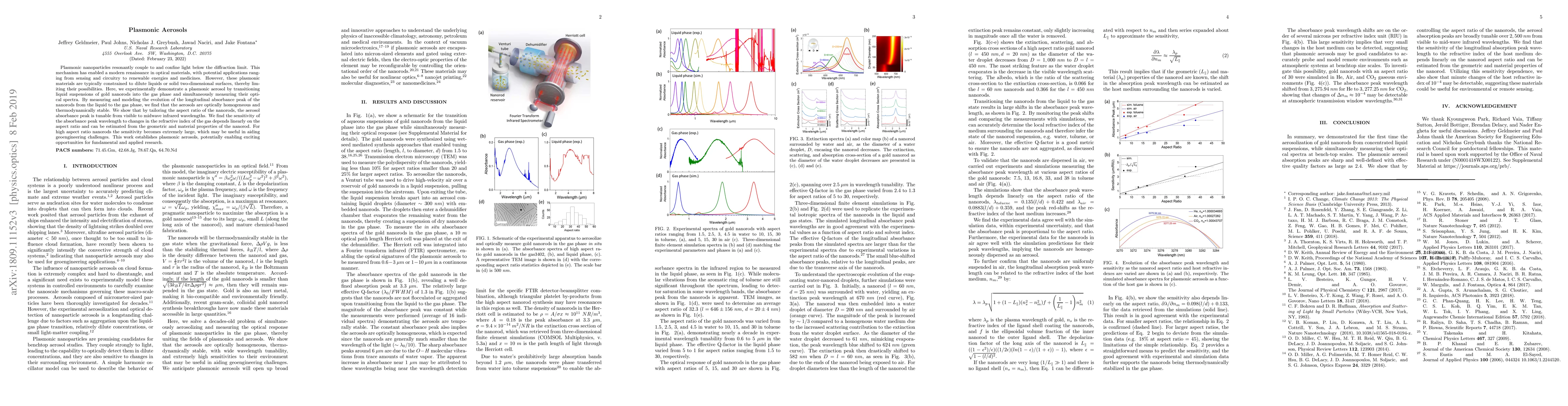 Plasmonic nanoparticles resonantly couple to and confine light below the diffraction limit. This mechanism has enabled a modern renaissance in optical materials, with potential applications ranging from sensing and circuitry to renewable energies and medicines. However, these plasmonic materials are typically constrained to dilute liquids or solid two-dimensional surfaces, thereby limiting their possibilities. Here, we experimentally demonstrate a plasmonic aerosol by transitioning liquid suspensions of gold nanorods into the gas phase and simultaneously measuring their optical spectra. By measuring and modeling the evolution of the longitudinal absorbance peak of the nanorods from the liquid to the gas phase, we find that the aerosols are optically homogeneous and thermodynamically stable. We show that by tailoring the aspect ratio of the nanorods, the aerosol absorbance peak is tunable from visible to mid-wave infrared wavelengths. We find the sensitivity of the absorbance peak wavelength to changes in the refractive index of the gas depends linearly on the aspect ratio and can be estimated from the geometric and material properties of the nanorod. For high aspect ratio nanorods the sensitivity becomes extremely large, which may be useful in aiding geoengineering challenges. This work establishes plasmonic aerosols, potentially enabling exciting opportunities for fundamental and applied research.
