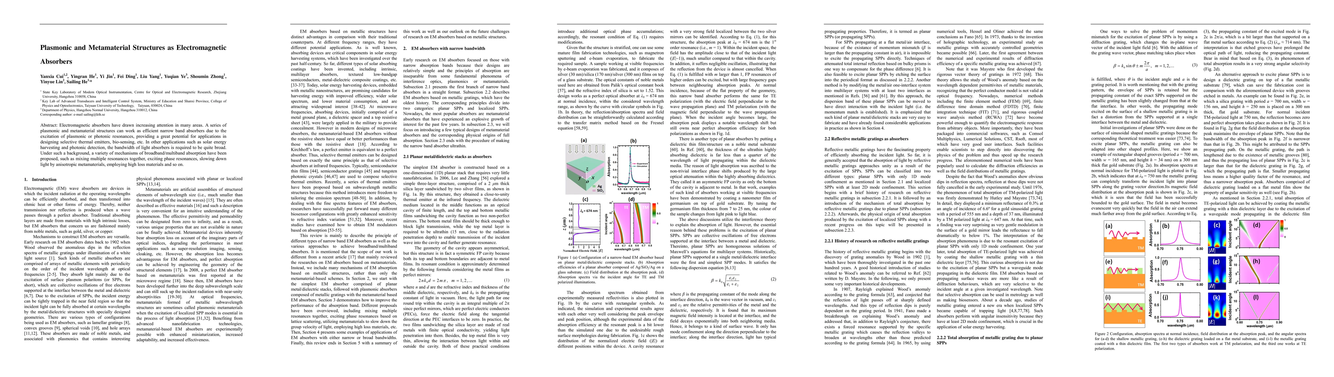 Electromagnetic absorbers have drawn increasing attention in many areas. A series of plasmonic and metamaterial structures can work as efficient narrow band absorbers due to the excitation of plasmonic or photonic resonances, providing a great potential for applications in designing selective thermal emitters, bio-sensing, etc. In other applications such as solar energy harvesting and photonic detection, the bandwidth of light absorbers is required to be quite broad. Under such a background, a variety of mechanisms of broadband/multiband absorption have been proposed, such as mixing multiple resonances together, exciting phase resonances, slowing down light by anisotropic metamaterials, employing high loss materials and so on.