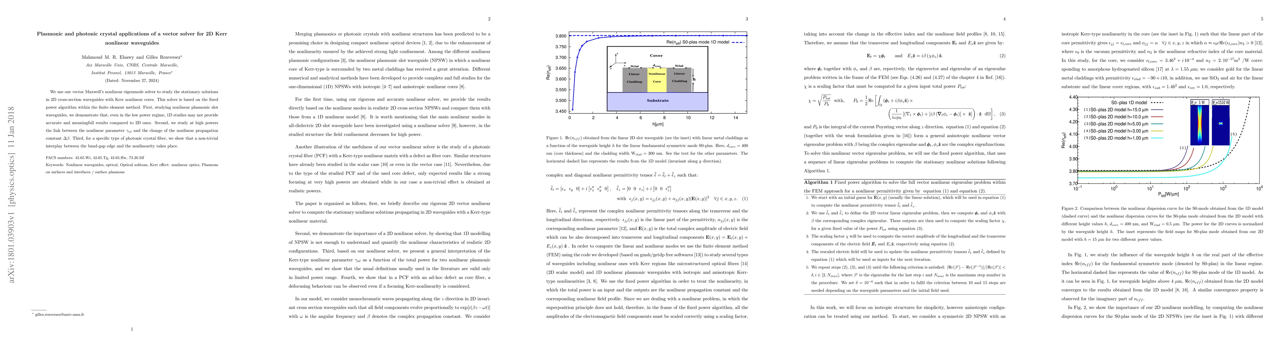 We use our vector Maxwell's nonlinear eigenmode solver to study the stationary solutions in 2D cross-section waveguides with Kerr nonlinear cores. This solver is based on the fixed power algorithm within the finite element method. First, studying nonlinear plasmonic slot waveguides, we demonstrate that, even in the low power regime, 1D studies may not provide accurate and meaningfull results compared to 2D ones. Second, we study at high powers the link between the nonlinear parameter $\gamma_{nl}$ and the change of the nonlinear propagation constant $\Delta \beta$. Third, for a specific type of photonic crystal fiber, we show that a non-trivial interplay between the band-gap edge and the nonlinearity takes place.