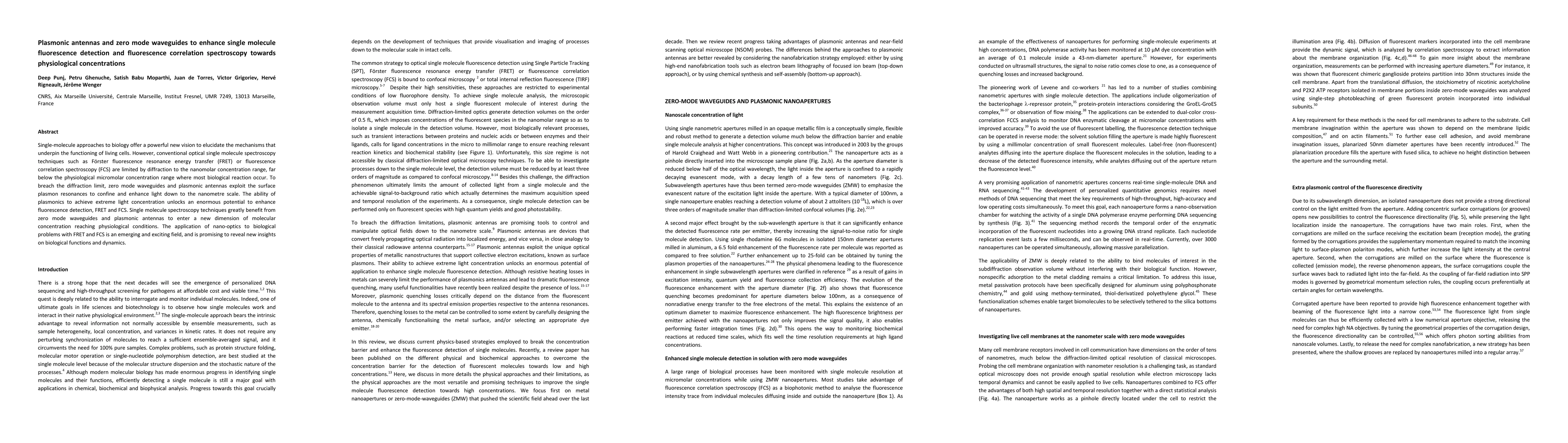 This paper explores the use of zero mode waveguides and plasmonic antennas to enhance single molecule fluorescence detection and fluorescence correlation spectroscopy, enabling these techniques to reach physiological micromolar concentrations, thus providing new insights into biological functions and dynamics.