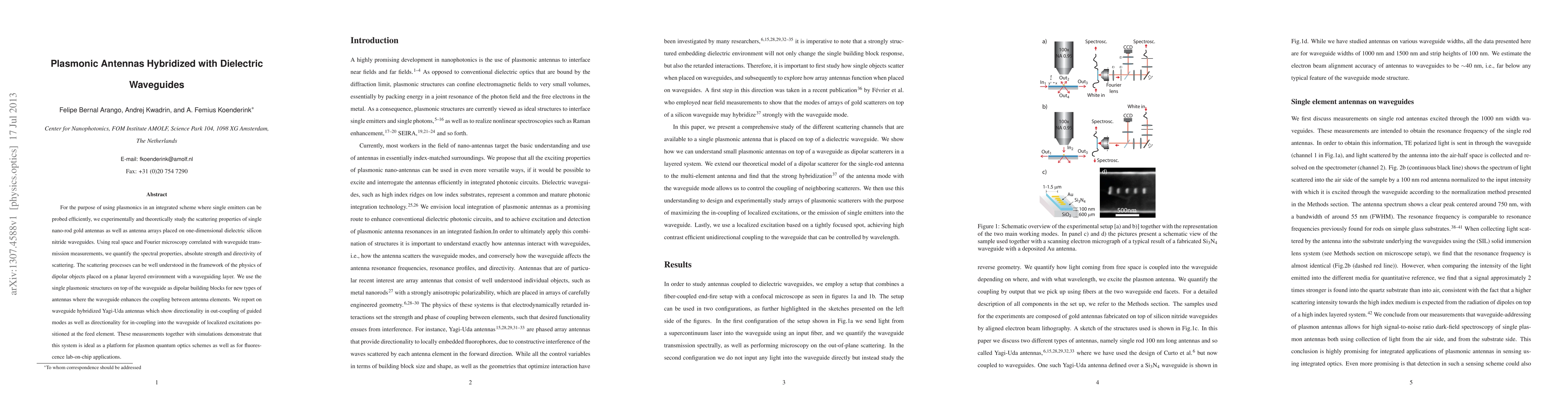 This paper investigates the scattering properties of gold nano-rod antennas hybridized with dielectric waveguides, demonstrating enhanced coupling and directionality for both in-coupling and out-coupling of guided modes. The study combines experimental and theoretical analysis to show potential applications in plasmon quantum optics and fluorescence-based lab-on-chip technologies.