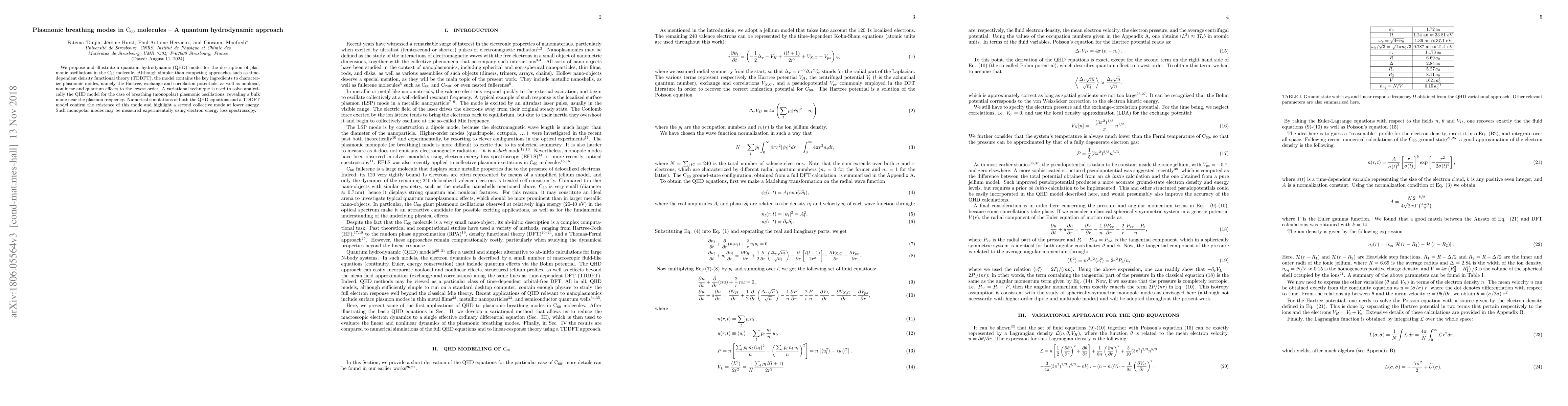We propose and illustrate a quantum hydrodynamic (QHD) model for the description of plasmonic oscillations in the $\rm C_{60}$ molecule. Although simpler than competing approaches such as time-dependent density functional theory (TDDFT), the model contains the key ingredients to characterize plasmonic modes, namely the Hartree, exchange and correlation potentials, as well as nonlocal, nonlinear and quantum effects to the lowest order. A variational technique is used to solve analytically the QHD model for the case of breathing (monopolar) plasmonic oscillations, revealing a bulk mode near the plasmon frequency. Numerical simulations of both the QHD equations and a TDDFT model confirm the existence of this mode and highlight a second collective mode at lower energy. Such monopolar modes may be measured experimentally using electron energy loss spectroscopy.