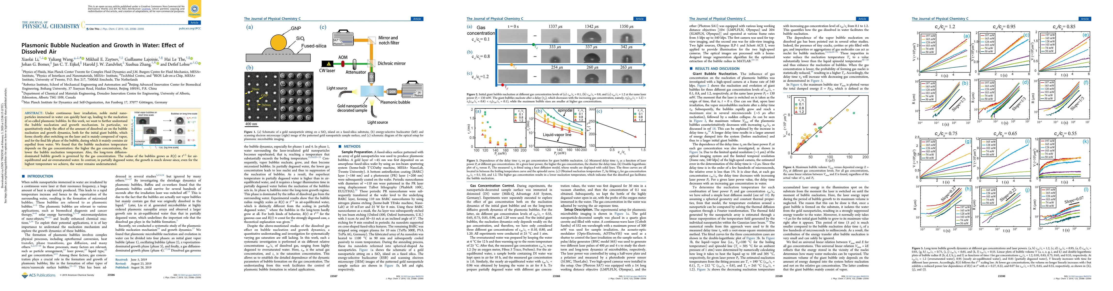 This paper investigates how dissolved air influences the nucleation and growth of plasmonic bubbles formed by laser-heated noble metal nanoparticles in water. Higher gas concentrations lower the bubble nucleation temperature and accelerate long-term growth, following a R(t)~t^1/3 scaling law in air-equilibrated water.