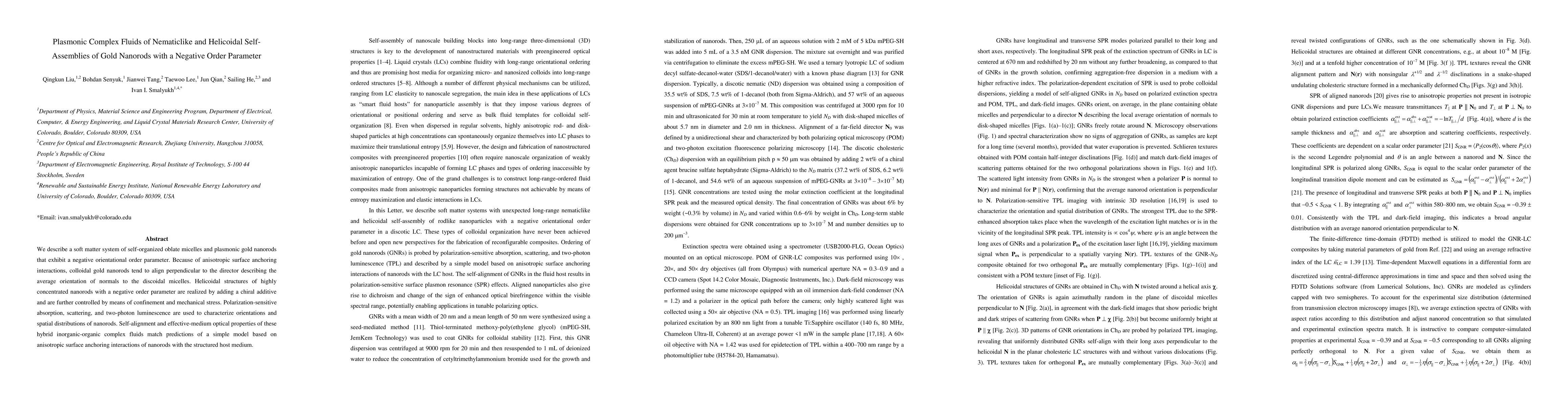 This paper investigates a soft matter system of self-organized plasmonic gold nanorods and oblate micelles with a negative order parameter, revealing anisotropic surface anchoring interactions that lead to perpendicular alignment. Helicoidal structures are achieved via chiral additives and controlled by confinement and mechanical stress, characterized by polarization-sensitive optical techniques.